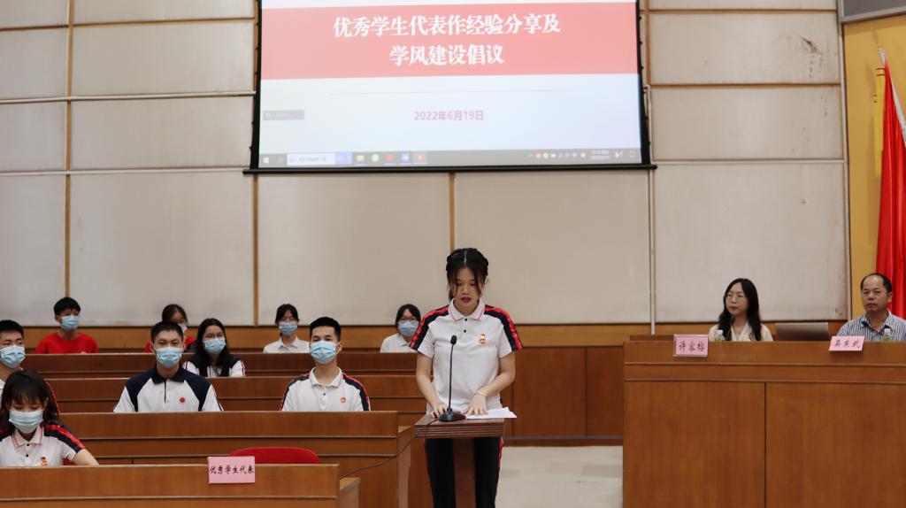 大會總結表彰了在2021-2022學年我院學風建設工作中涌現出的先進集體和先進個人,并為“2021級新生班級學風建設大賽獲獎班級”、“2021-2022年度共青團工作先進集體及個人”、“文明宿舍”、“優秀畢業生”等約50名優秀班集體代表及個人頒獎。190111班莫婷婷同學作為優秀學生代表作了交流發言,分享了三年學習生活的成長歷程,并發出學風建設倡議,倡議同學們樹立遠大志向和正確的學習觀,嚴守紀律,從細微處著手共塑學院優良學風。
