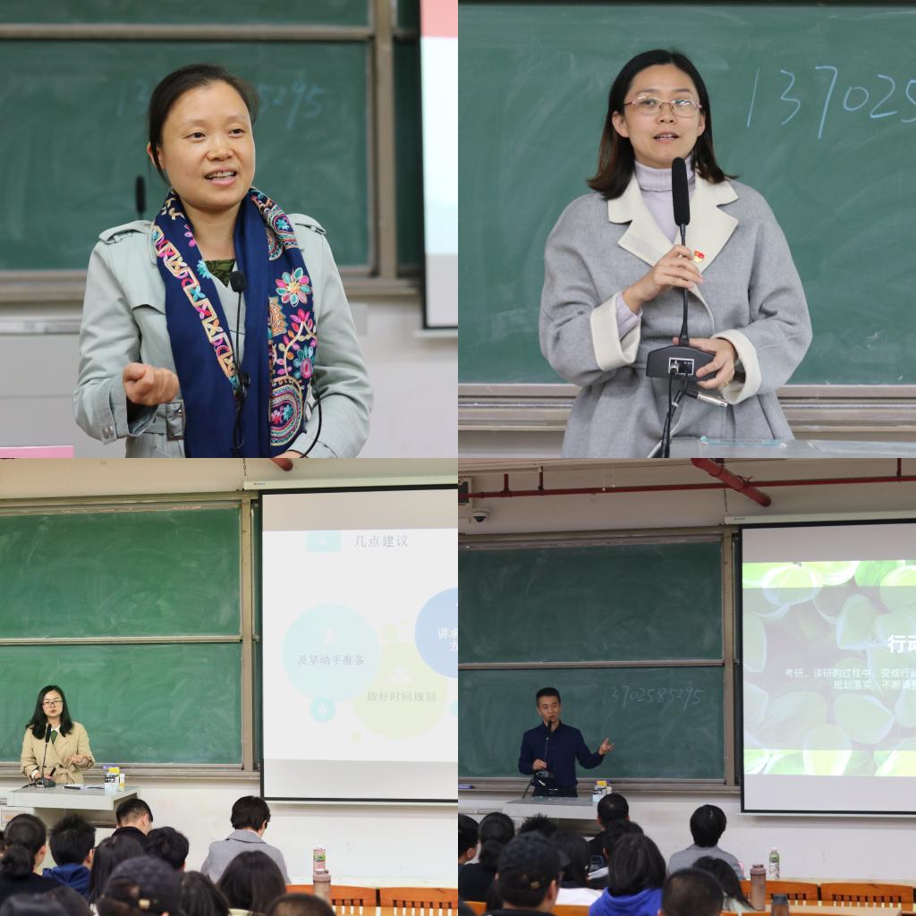 謝輝玲書(shū)記做了動(dòng)員講話,她從個(gè)人考研經(jīng)歷談起,鼓勵(lì)大家充分認(rèn)識(shí)到考研的重要性,強(qiáng)調(diào)考研是更好的就業(yè),希望大家能根據(jù)實(shí)際選擇合適的考研方向和學(xué)校,持之以恒堅(jiān)持到底,爭(zhēng)取更廣闊的發(fā)展空間。姜文仙副院長(zhǎng)分析了近幾年的考研形勢(shì),介紹了學(xué)校和學(xué)院近年來(lái)的研究生招錄情況,建議同學(xué)們要及早準(zhǔn)備、明確定位、貴在有恒;彭敏晶教授重點(diǎn)介紹了學(xué)院兩個(gè)碩士點(diǎn)情況、研究方向、學(xué)校的獎(jiǎng)助體系以及畢業(yè)去向等,從人格成長(zhǎng)、視野拓展、專業(yè)深化等多角度鼓勵(lì)同學(xué)們積極考研,全面提升個(gè)人的綜合素質(zhì),增強(qiáng)市場(chǎng)競(jìng)爭(zhēng)力。