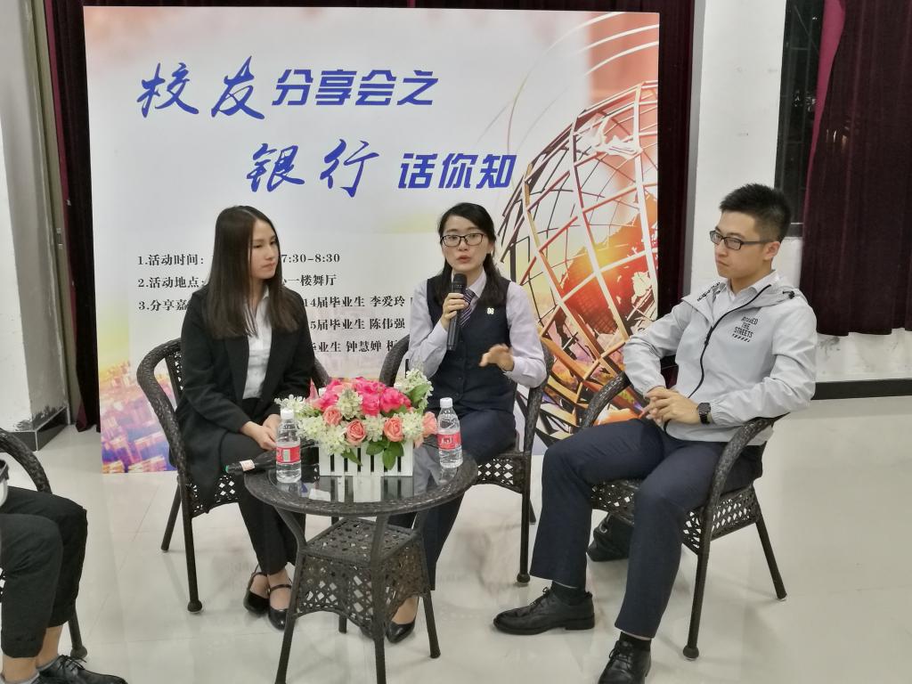 11月3日晚,五邑大學經濟管理學院在學生活動中心一樓舉辦了校友分享會之銀行話你知活動。本次分享會,我們邀請到了3位校友,分別是新會農村商業銀行內訓師李愛玲師姐(2014屆)、中國光大銀行金融理財師陳偉強師兄(2015屆)、中國銀行鐘慧嬋師姐(2017屆),到場給各位同學分享職場心得。