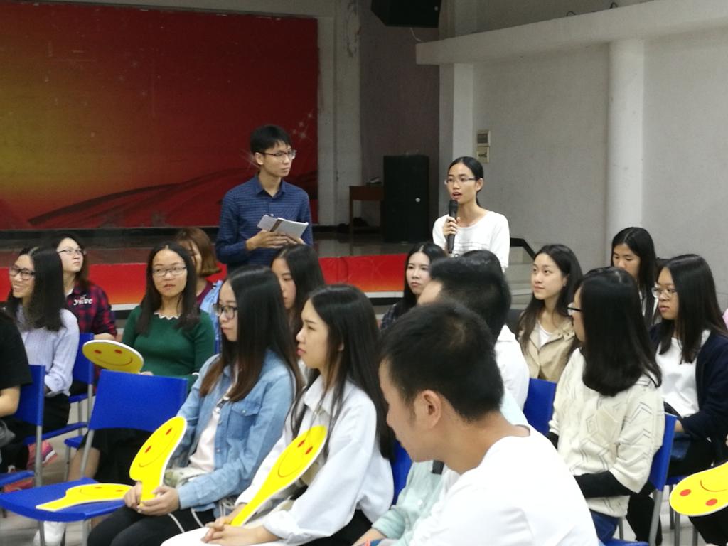 三位嘉賓先做了簡短的自我介紹,之后的活動共有兩個環節,第一個環節是由主持人代表在校生開門見山的向校友們提問,主要圍繞銀行網申、筆試面試技巧、企業HR看重的員工素質、給即將畢業的學生提建議等,三位主講人分別說出了自己的看法。李愛玲和鐘慧嬋師姐都提出了專業知識的掌握和英語的重要性。陳偉強師兄建議,要注意發展自己的特長,現在許多企業重視企業文化建設,有的企業有專門的環節考特長,要多展現自己;加入社團、學生組織,這些經歷在將來面試時也會成為優勢,曾經的歷練能幫助大家更快地融入工作,更好地和同事相處。