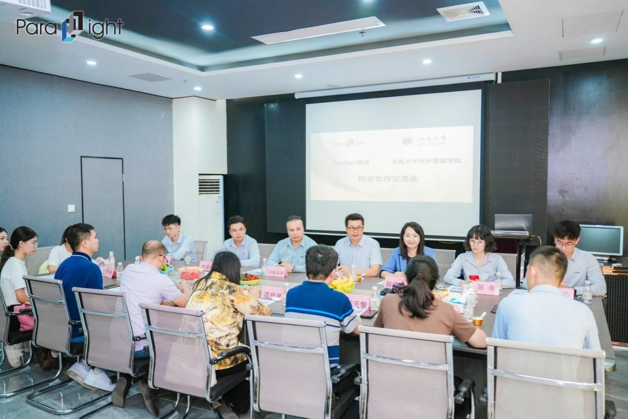 座談會上,黃高余詳細介紹了平行光集團的發展歷程、產品特點、未來規劃以及企業文化,歡迎邑大學子來企業共謀事業。同時,他也分享了自己的創業心得和體會,鼓勵學弟學妹們要勇于追求夢想,敢于創新實踐。范佳鳳代表學院向平行光集團表示了衷心的感謝,并對黃高余校友的創業成就給予了高度評價。她表示,學院一直致力于培養學生的實踐能力和創新精神,希望通過此次走訪活動,能夠加強校企之間的合作與交流,為學生們提供更多的實踐機會和就業渠道。隨后,雙方就學院的人才培養、教學改革、實習就業、科研合作等方面與平行光集團進行了深入交流,達成了多項合作意向。