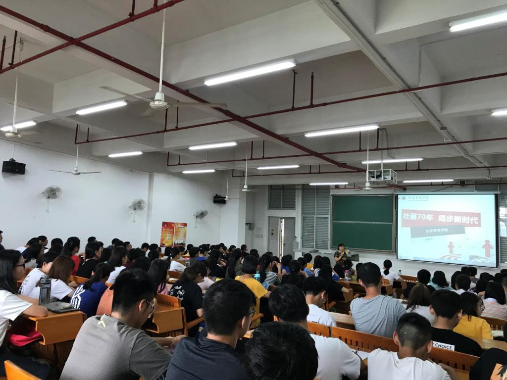 9月17日上午,經濟管理學院黨總支書記謝輝玲在北主樓601教室給2019級新生約180人講授了本學期第一堂思政課。