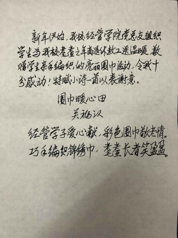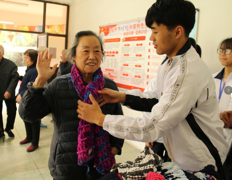 為更好開展本次冬日送溫暖活動,我院青年志愿者協會做了充分的準備,從活動策劃、宣傳擺攤到招募志愿者,每個環節都有條不紊。學生志愿者們把對老師的感恩之情都寄托在一針一線中,一絲不茍地地編織出一條條飽含溫情的圍巾。在場的志愿者們親手為離退休教師圍上暖暖的圍巾,并送上真摯的新春祝福。本次活動一共送出了80條圍巾,受到了離退休老師們的熱烈歡迎。此次活動,也充分表達了我院師生對離退休教師真誠的謝意和崇高的敬意。