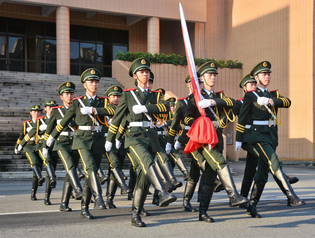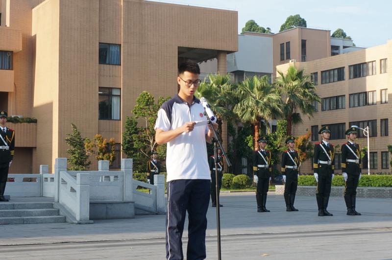 7時整,國旗護衛(wèi)隊邁著整齊劃一的步伐護送國旗到升旗臺。伴隨著激昂雄壯的國歌聲,鮮艷的五星紅旗冉冉升起,迎風飄揚,全體師生肅立注目。