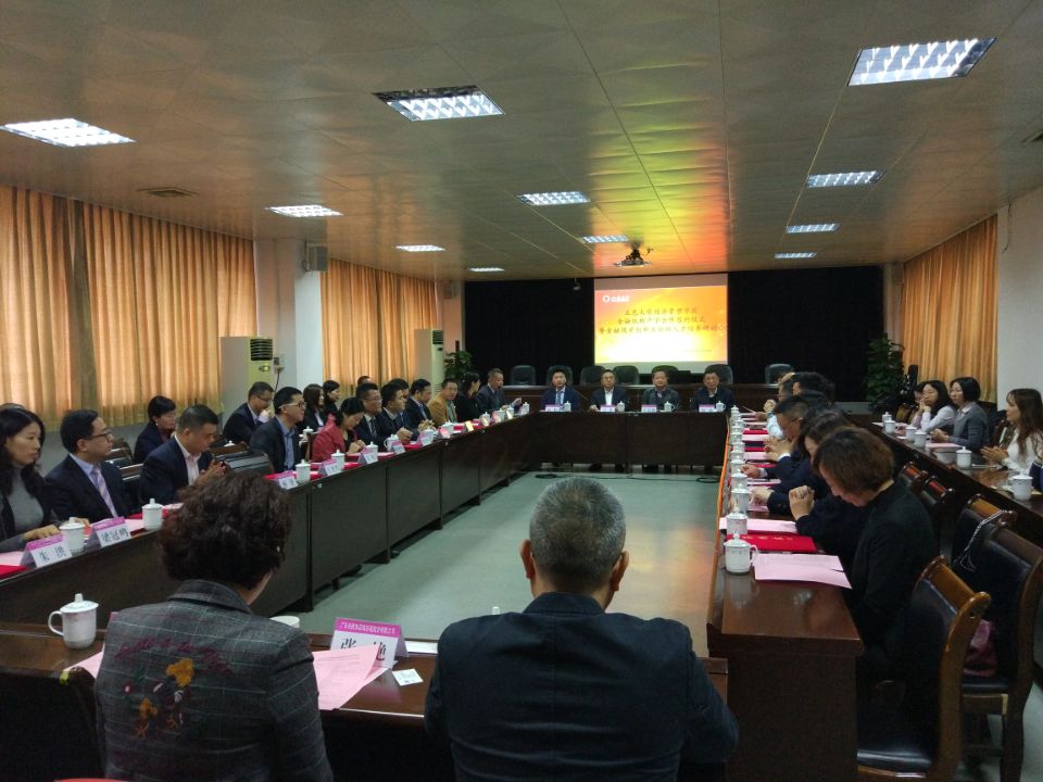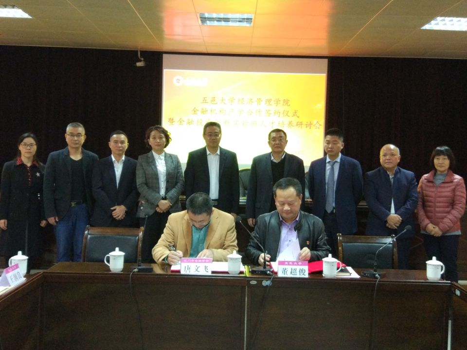 12月13日上午,經濟管理學院金融機構產學合作簽約儀式暨金融投資創新實驗班人才培養研討會在我校南主樓七樓大會議室隆重舉行。江門市金融學會會長馬俊、中國人民銀行江門市中心支行副行長何斌等26家金融機構負責人,和我校董超俊副校長、教務處紀秋穎處長、經濟管理學院領導、老師共50余人出席了會議。