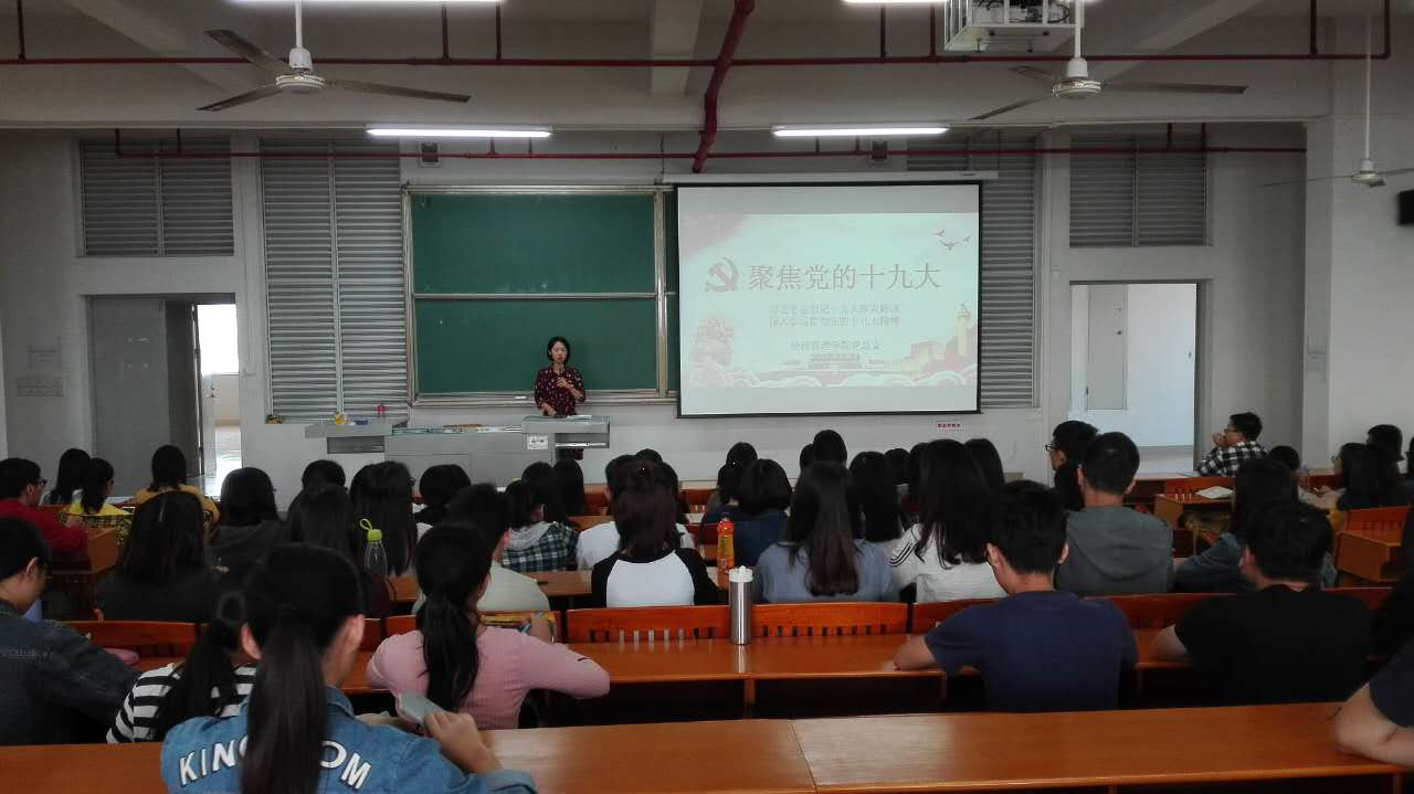 2017年10月31日,經濟管理學院黨總支副書記吳小霞在北主樓801為我院學生黨員講授了“聚焦黨的十九大”專題黨課。吳書記在黨課中諄諄善誘,生動、全面地為學生黨員們解讀了十九大的報告內容以及會議精神。