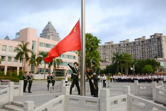 7點整,國旗護衛(wèi)隊旗手邁著整齊劃一的步伐護送國旗到升旗臺,在莊嚴(yán)的歌聲中,迎風(fēng)飄揚的五星紅旗緩緩升起,全體師生莊嚴(yán)肅穆。