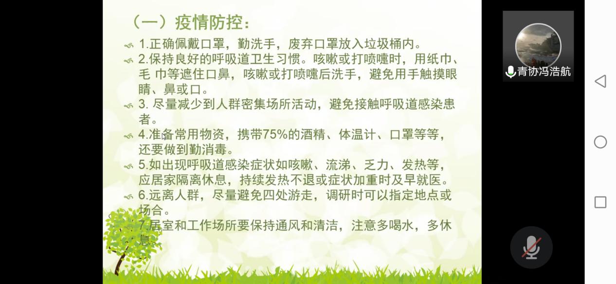 會議伊始,我院青年志愿者協會黃琳首先介紹了本次社會實踐的基本情況,在今年疫情防控的特殊情況下,我院社會實踐工作有序推進,共申報23個項目,參與學生共計189人,其中鄉村教育幫扶服務團隊3支,“多彩鄉村”主題教育實踐團隊13支,科技扶貧助農服務團隊3支,基層社會調研團隊2支,疫情防控宣講服務團隊1支,農村脫貧扶農團隊1支。此外,馮浩航同學就實踐活動過程中的注意事項、紀律要求、宣傳細則、團隊實踐結束后需提交的材料等方面進行講解,提醒同學們在實踐過程中提高安全意識,保障個人安全。