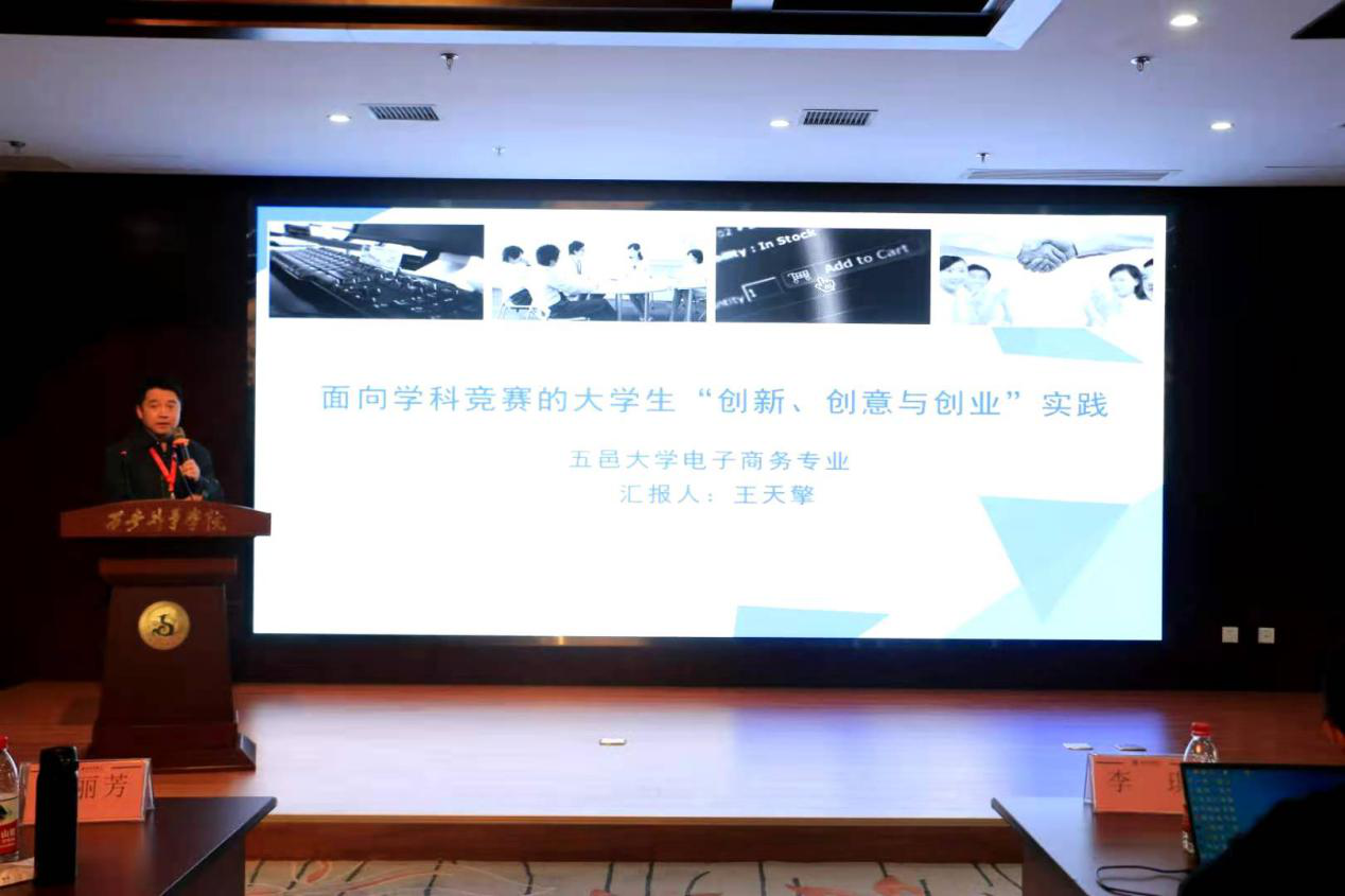 作為唯一受邀地方高校,王天擎副教授作了《面向學科競賽的大學生“創新、創意與創業”實踐教學》的主題演講。演講從學科競賽發展歷程、三創學生組織建設、三創文化活動、三創項目實踐、三創課程改革、三創實踐總結、三創實踐成果和專家評價等多方面介紹了我校電子商務專業的實踐教學思路與經驗,受到了與會專家和同行的高度評價。