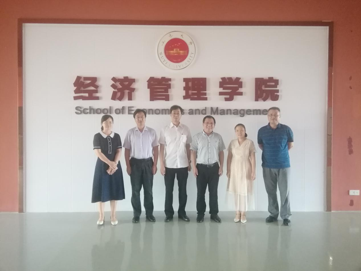 7月15日,武漢理工大學管理學院副院長王東武,組織與人力資源管理系副主任、副教授、博士生導師謝寶國一行來五邑大學經濟管理學院交流座談。五邑大學經濟管理學院李響副院長、吳東武副院長、姜文仙副院長及江門經濟研究中心副主任王潤良教授參加了此次交流座談。會議由李響副院長主持。