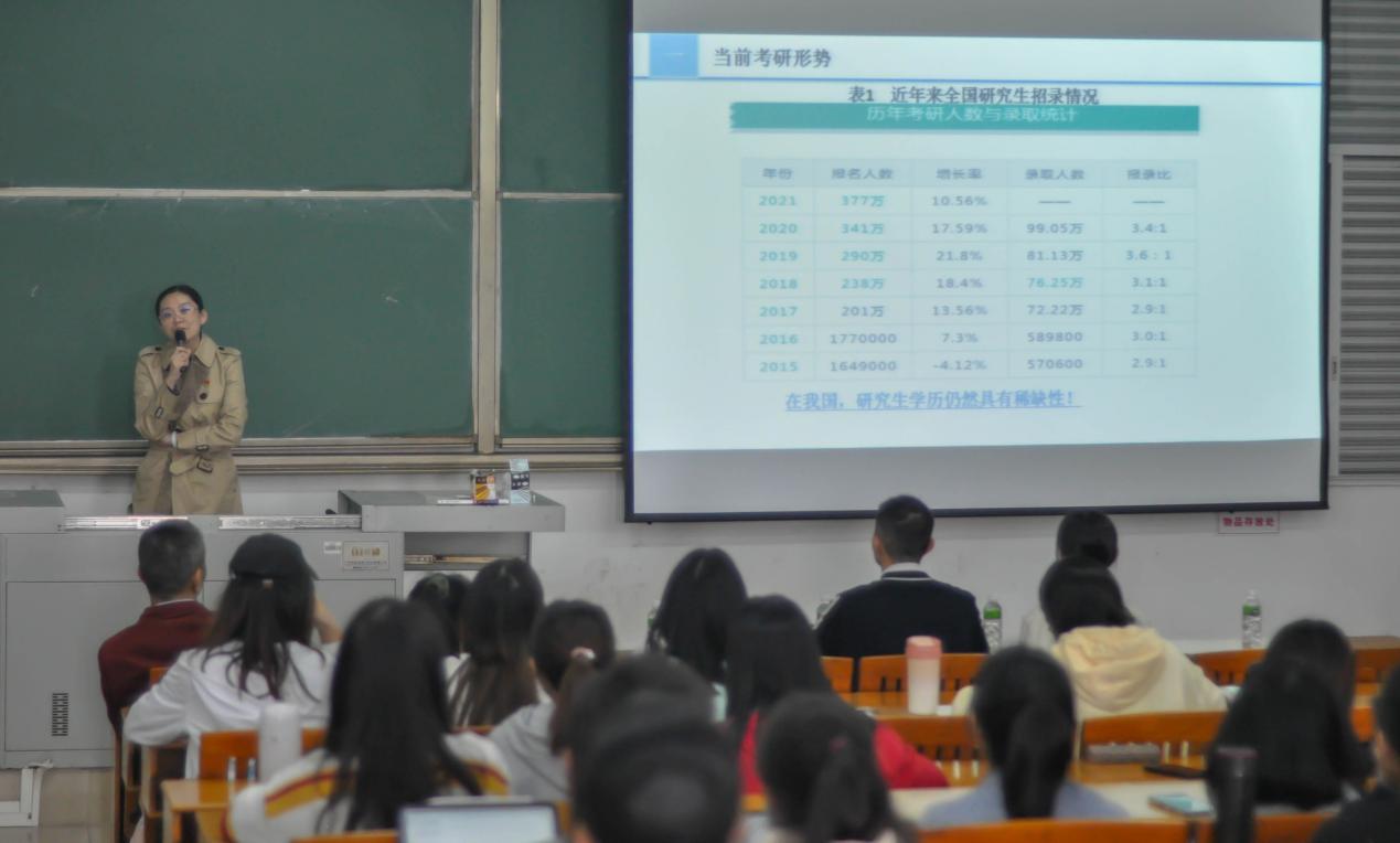 最后,學院黨委書記謝輝玲從個人考研經歷、疫情下的考研競爭形勢等方面向同學們悉心講解考研的重要性和挑戰性,重點向同學們介紹了選擇報考本校研究生的優勢,勉勵同學們養成良好學習和作息習慣,在考研學習中磨煉意志,提升學習能力,增加知識儲備,向更高學歷層次發起沖擊,爭取站在更高平臺上開啟個人職業生涯。