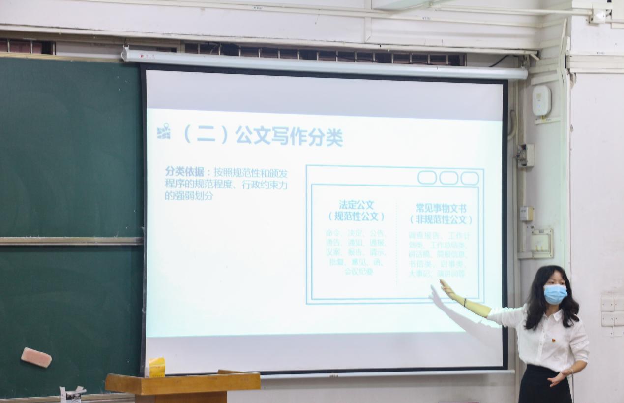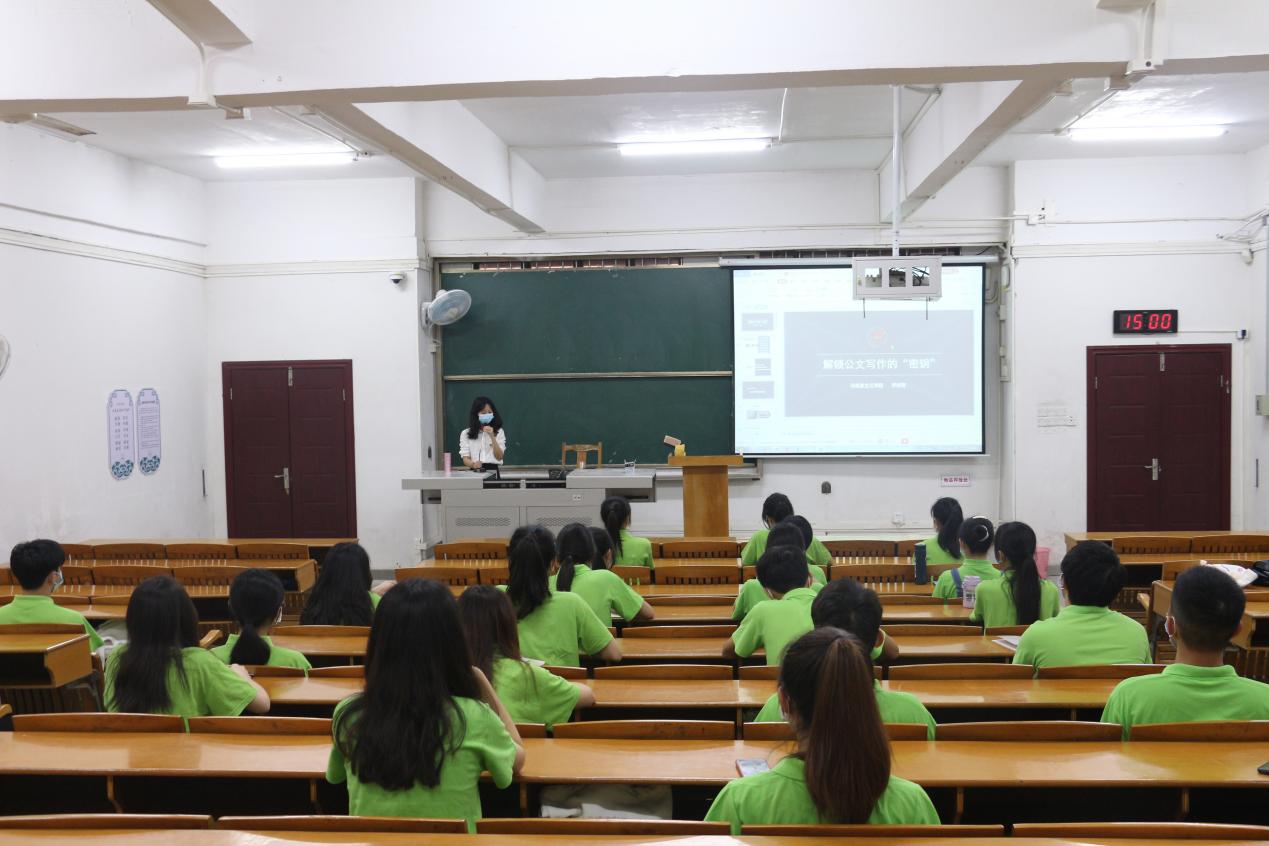羅林青老師從學(xué)生工作常見公文寫作的特點、作用、分類和規(guī)范多個角度出發(fā),全面細致地介紹了公文的基礎(chǔ)知識。她強調(diào),寫好公文,不僅要認真學(xué)習(xí)各類寫作基本構(gòu)架和方法,準確把握主題,并要形成自己的見解和觀點,更要重視日常工作資料的積累。她通過實例講解,由淺入深,循序漸進,積極和同學(xué)們交流互動,在這次培訓(xùn)中現(xiàn)場氣氛活躍,互動形式多樣,使同學(xué)們對公文寫作有了新的認識,了解掌握了基本公文形式。