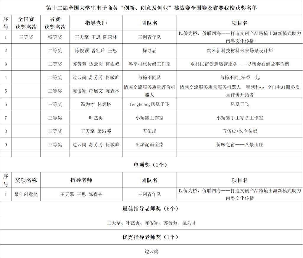 據統計,本屆大賽我校共有161支隊伍報名,涵蓋傳統賽道152支隊伍,跨境實戰賽道9支隊伍。經過校賽、省賽層層選拔,其中傳統賽道15支隊伍及跨境實戰賽道2支隊伍進入省級賽。由經濟管理學院王天擎、王思老師,企業導師陳森林共同指導的三創青年隊的《以僑為橋,僑聯四海—打造文創產品跨境出海新模式助力南粵文化傳播》項目斬獲全國三等獎,同時還榮獲廣東省賽區“最佳創意獎”和“最佳指導老師”的好成績;探尋者隊的《納米新科技材料未來場景設計師》等3個項目獲省賽二等獎;《情感交流服務質量服務機器人智感科技-全自主AI服務質量評價開拓者》等5個項目獲省賽三等獎。