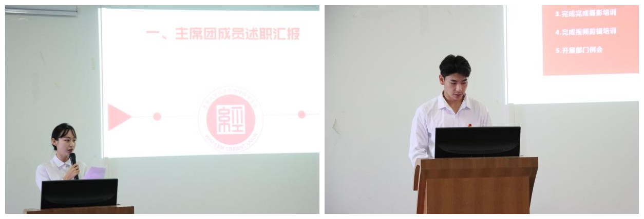 會(huì)上,學(xué)生會(huì)2名主席團(tuán)成員與7名部門負(fù)責(zé)人依次上臺(tái)作述職報(bào)告,重點(diǎn)匯報(bào)了學(xué)生會(huì)本學(xué)年學(xué)術(shù)科技節(jié)、文體藝術(shù)活動(dòng)開展情況和“校-院-班”三級(jí)聯(lián)動(dòng)交流情況;圍繞全心全意為同學(xué)服務(wù)的宗旨,從政治思想、學(xué)習(xí)情況、工作匯報(bào)、紀(jì)律作風(fēng)等方面介紹了工作亮點(diǎn)及成效,分析了工作中存在的問題及不足,闡明了加強(qiáng)組織建設(shè)的改進(jìn)措施及工作計(jì)劃。