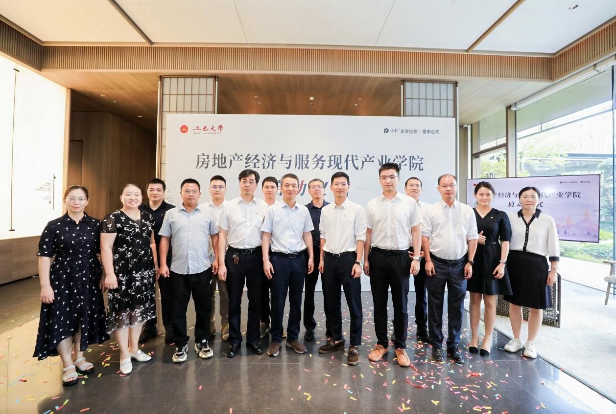 7月24日上午,“五邑大學-保利粵中 房地產經濟與服務現代產業學院”于江門保利瑯悅營銷中心盛大啟幕。五邑大學經濟管理學院院長彭敏晶、副院長李響以及經濟管理學院市場營銷、工商管理等相關專業教師及輔導員參加了揭牌啟動儀式。