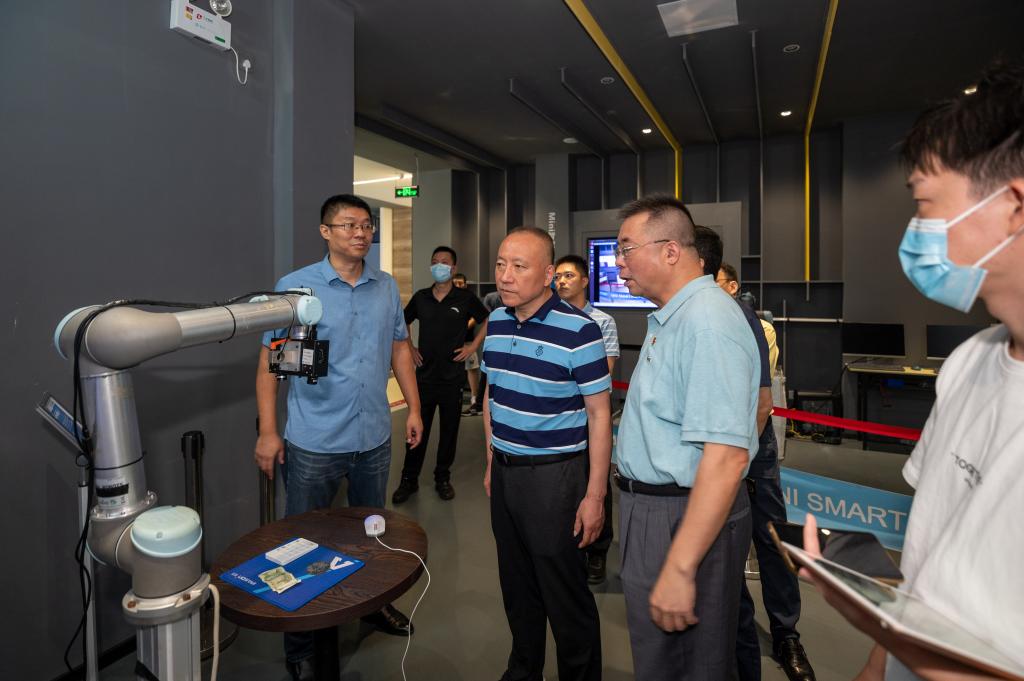 隨后來到了位于江門樓的人工智能學習館參觀。智能制造學部副部長黃輝向大家介紹了我校人工智能學習館的基本情況,并引導參觀體驗了館內人工智能設施。各位領導駐足體驗虛擬人實時建模成像等系統,現場感受人工智能技術帶來的良好體驗。