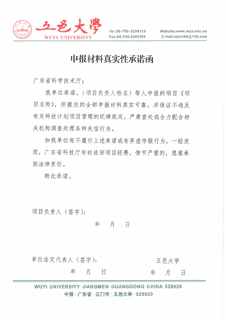 申報省科技項目需提供申報材料真實性承諾函,請申請人下載此模板(已按學校公文格式排版)進行填寫,并用五邑大學信箋紙打印。