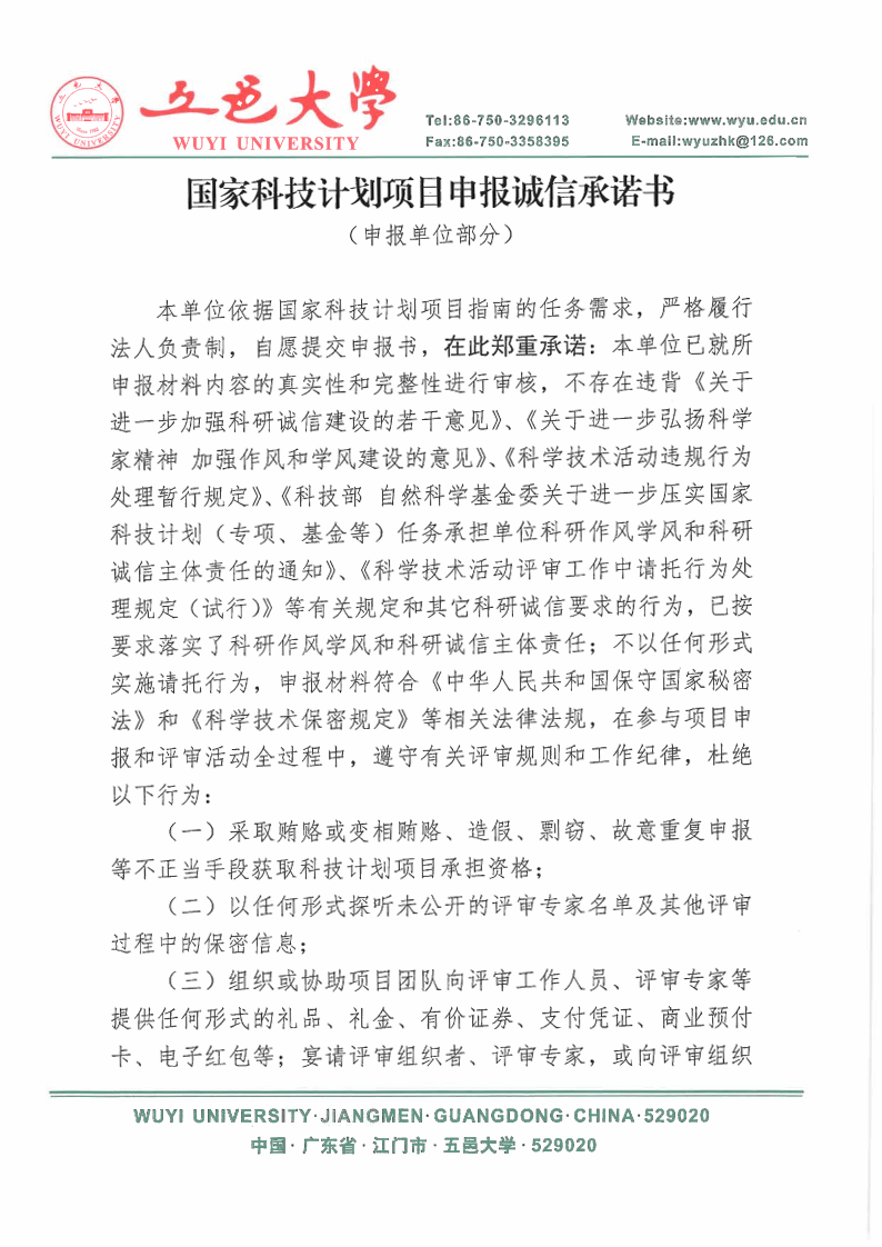 申報(bào)國家科技計(jì)劃項(xiàng)目需提供申報(bào)誠信承諾書(申報(bào)單位部分),請申請人下載此模板(已按學(xué)校公文格式排版)并用五邑大學(xué)信箋紙打印。