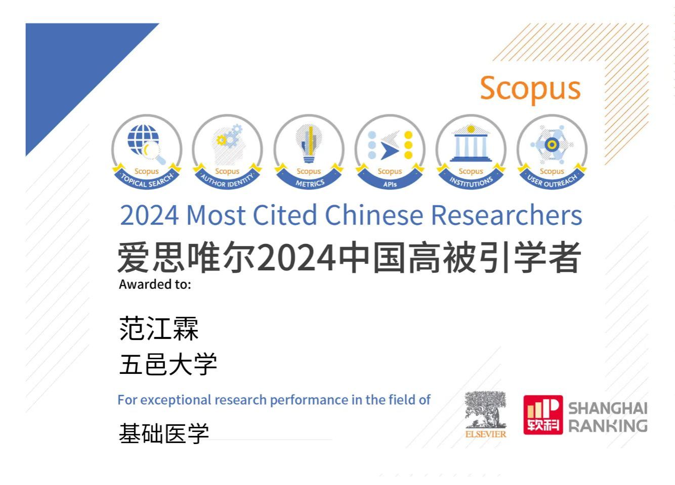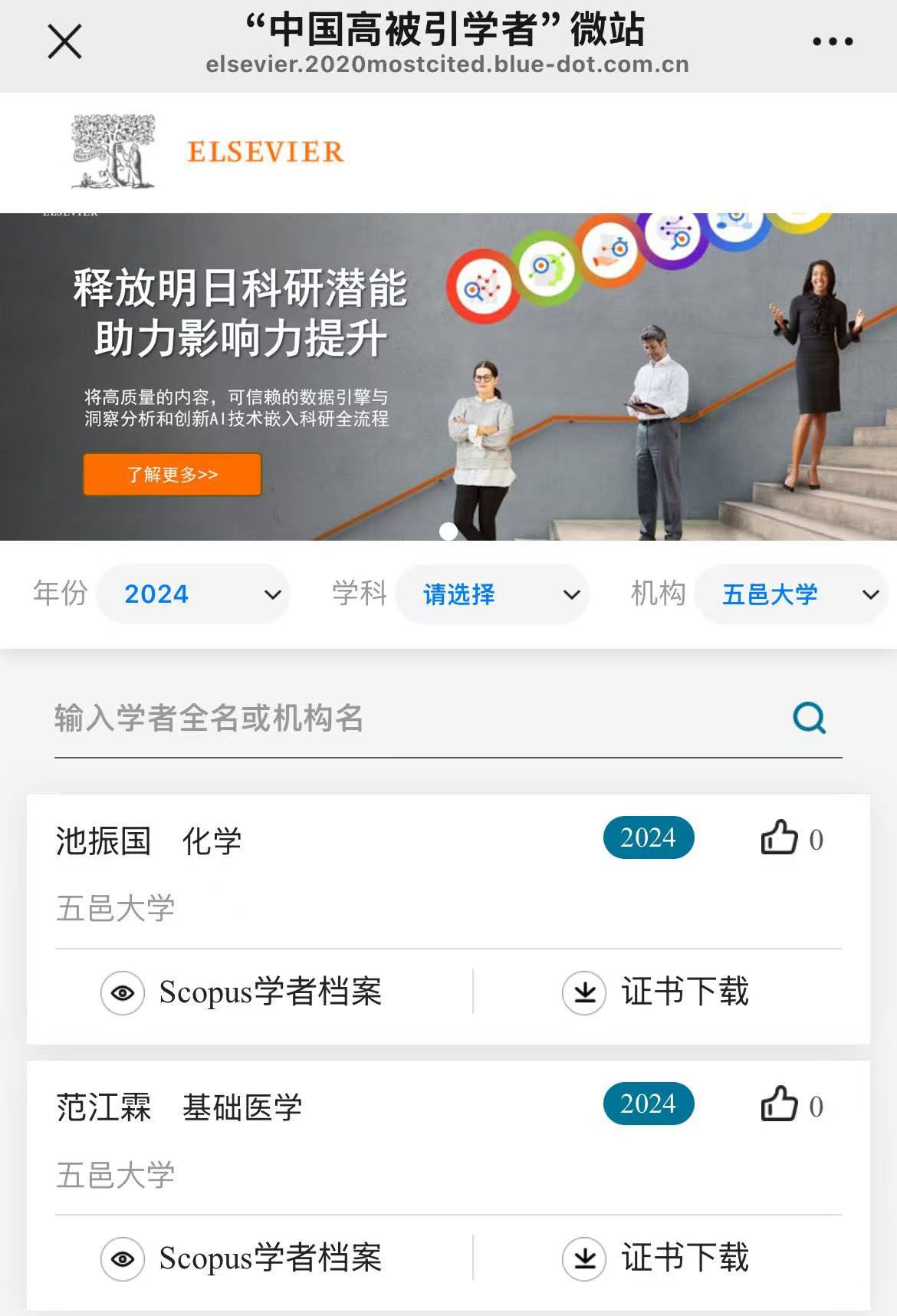 3月25日,愛思唯爾(Elsevier)發布2024“中國高被引學者”(Highly Cited Chinese Researchers)榜單,來自547所高校、企業及科研機構的6388人上榜,覆蓋教育部10個學科領域、83個一級學科。我校池振國教授、范江霖教授再次入選此次榜單。