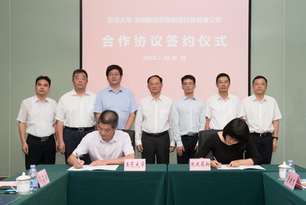 7月30日,市委書記、市人大常委會主任林應武出席五邑大學與深圳乾延藥物研發科技有限公司合作協議簽訂儀式。江門市常務副市長許曉雄、副市長蔡德威和市相關部門領導,深圳乾延藥物研發科技有限公司總經理助理許超、天然產物組組長郭益安,五邑大學校長張運華、校黨委副書記李靄康參加了儀式。