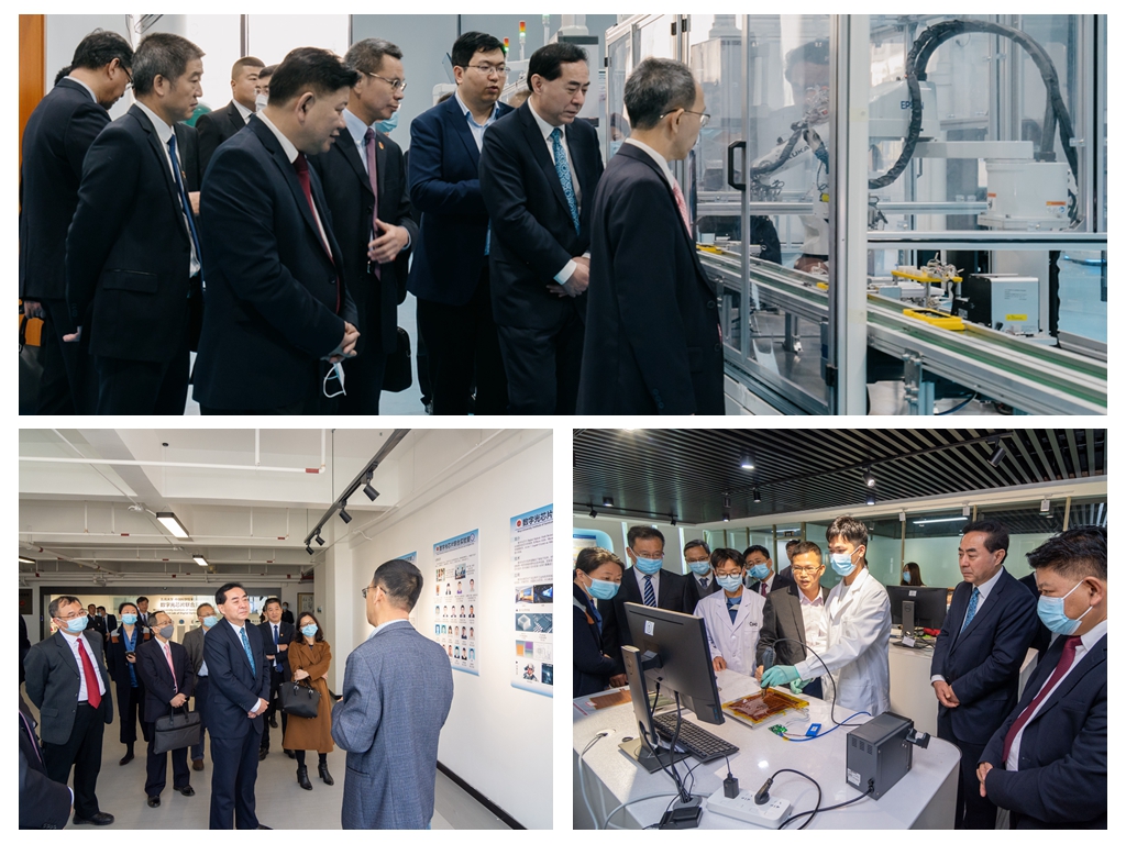 圖2 廣東省科學院廖兵書記等領導一行實地考察五邑大學“數字光芯片聯合實驗室”“柔性傳感材料與器件研究開發中心”“現代工業生產技術綜合訓練中心”等為代表的創新平臺和實踐平臺