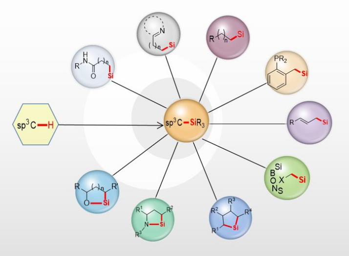 硅元素,與碳同屬于元素周期表第IV主族,兩者在化學性質上既存在許多的共同點,同時又表現出諸多差異性。有機硅化合物廣泛應用于新材料、醫藥等領域,通過C-H鍵活化策略是引入硅元素的重要途徑之一。該論文綜述了不同導向基團引導的過渡金屬催化sp3C-H鍵活化構建新型C-Si鍵的偶聯反應的最新研究進展,總結并歸納了9種不同類型的過渡金屬催化sp3C-H鍵硅基化反應,以及展望了有機硅化合物合成新方法的未來趨勢和應用前景。