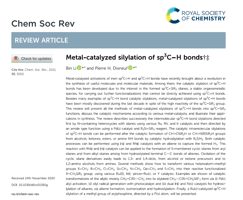近日,生物科技與大健康學院李濱教授以第一作者和共同通訊作者身份,與法國雷恩第一大學Pierre H Dixneuf教授在化學綜合頂級期刊《Chemical Society Reviews》(影響因子42.846)上發表論文“Metal-Catalyzed Silylation of sp3C-H Bonds”(2021,50, 5062-5085)。這是我校首次以第一作者單位在該著名期刊上發表論文。