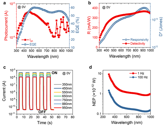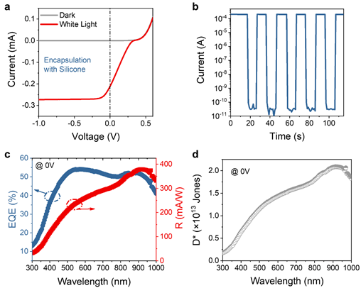 圖6. 用有機硅膠封裝器件后的光電性能。封裝器件光暗(a)I-V和(b)I-T曲線。(c)外量子效率和響應度譜。(d)比探測率譜。