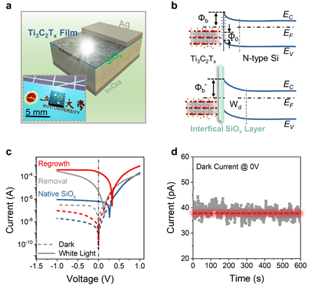 圖2. 通過界面調控改善Ti3C2/Si光電探測器的光電特性。(a)Ti3C2/界面SiOx層/Si光電探測器示意圖。(b)化學溶液生長界面SiOx層前后異質結能帶結構。(c)不同界面的Ti3C2/Si光電探測器光、暗I-V曲線。(d)在0V偏壓下,Ti3C2/界面生長SiOx層/Si光電探測器暗電流測試。