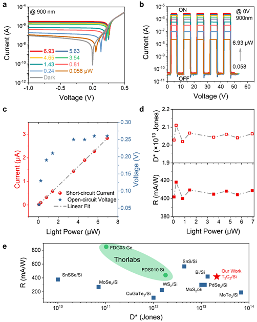圖4. 波長為900nm在不同光照強度下(a)I-V和(b)I-T曲線。(c)短路電流和開路電壓隨光功率的變化曲線。(d)響應度和比探測率隨光功率的變化曲線。(e)響應度和比探測率與文獻報道和商用探測器對比。