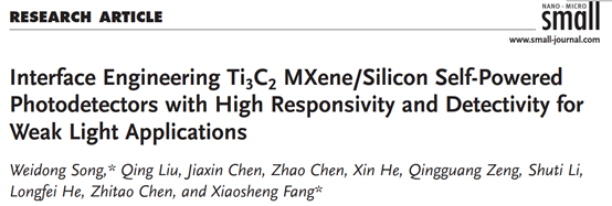 近日,五邑大學宋偉東博士和復旦大學方曉生教授合作在國際知名期刊Small上發表一篇題目為Interface Engineering Ti3C2 MXene/Silicon Self-powered Photodetectors with High Responsivity and Detectivity for Weak Light Applications的研究論文,報道了一種通過簡易的化學溶液生長界面SiOx層改善界面質量的方法,發現該方法可同時抑制Ti3C2MXene/Si光電探測器暗電流和改善光響應。該探測器在自驅動模式下,具有超高的比探測率(2.03×1013 Jones)和響應度(402 mA W-1)。同時,該探測器光暗比超過106,外量子效率峰值可達到60.3%。