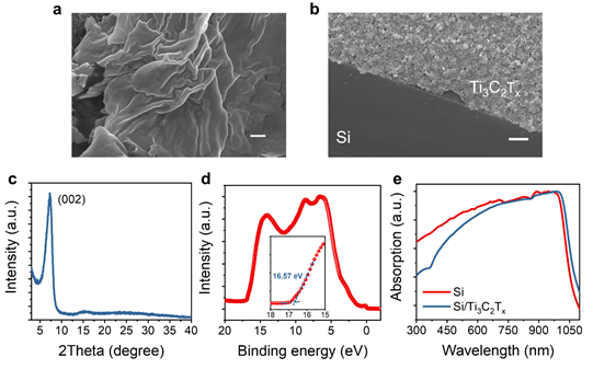 圖1. Ti3C2材料微觀形貌、XRD、UPS和光學特性。(a)剝離的Ti3C2納米片和(b)Ti3C2納米片噴涂沉積在硅上制備的薄膜SEM圖。Ti3C2納米膜(c)XRD、(d)UPS和(e)UV-Vis測試。