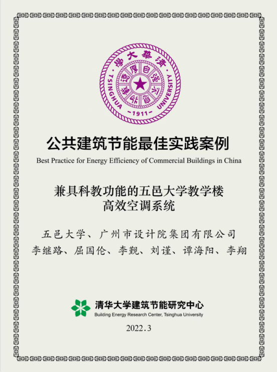 近日,五邑大學“兼具科教功能的五邑大學教學樓高效空調系統”項目,經由中國工程院江億院士領銜的行業頂尖專家團隊評選,從38個優秀項目中脫穎而出,獲評為全國8個“公共建筑節能最佳實踐案例”之一,并被收錄于中國工程院咨詢項目《中國建筑節能年度發展研究報告2022》。在3月26日第十八屆清華大學建筑節能學術周公共論壇上,江億院士為該項目團隊頒獎,項目副總工程師李繼路應邀作專題報告。該項目成果得到了與會專家及同行的高度關注和一致好評,線上直播時全國同時在線觀看人數達2.6萬。