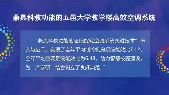 該項目是由五邑大學與廣州市設計院集團有限公司、珠海格力電器股份有限公司等企業深度協同共創、打造的兼具科教功能的教學樓高效空調系統,是融合了多種先進技術的超低能耗空調系統,是一種全新的學校公共區域空調配置方式。