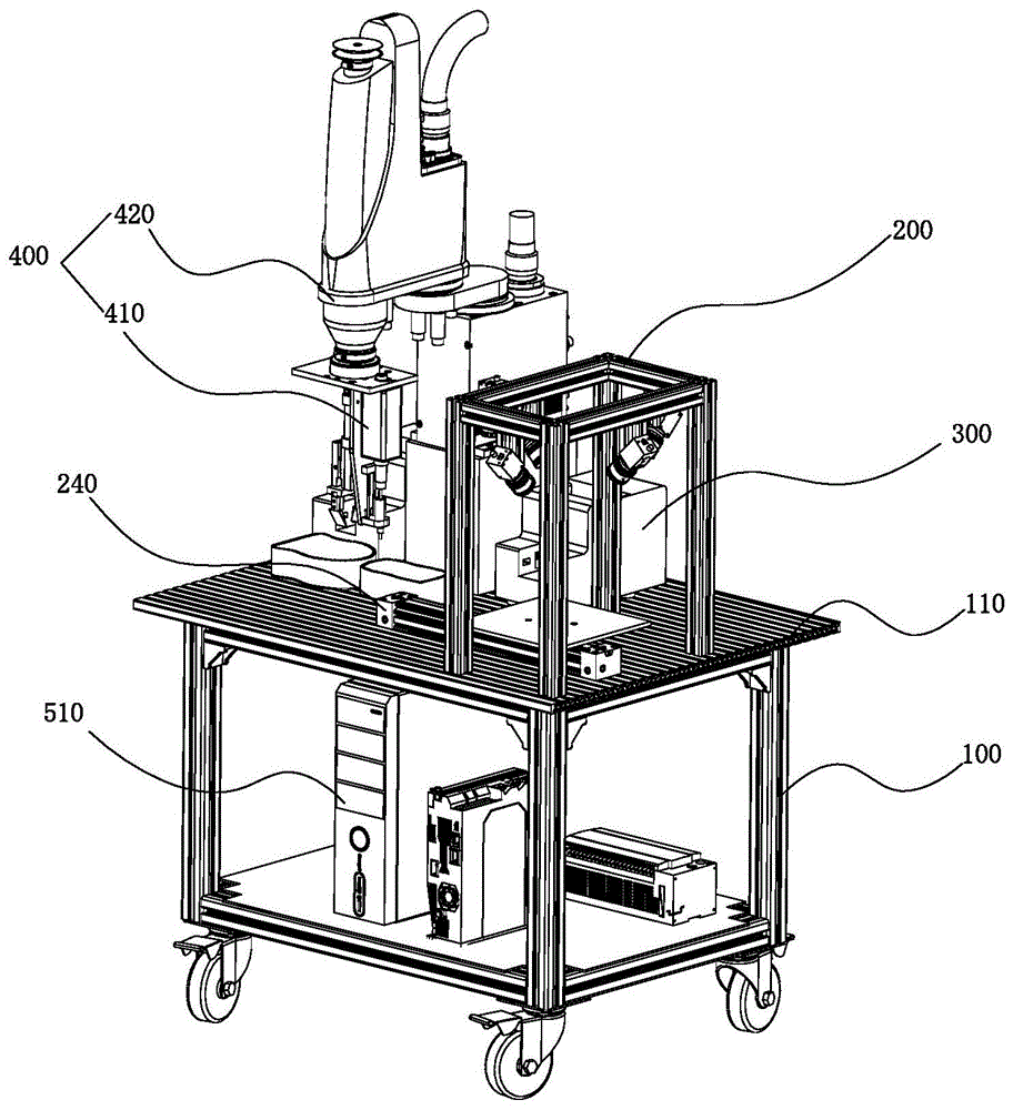 本發明公開了一種面向柔性制造的新型自動鎖螺絲機,包括支架,所述支架上設置有鎖付平臺;圖像采集區,所述圖像采集區設置于所述鎖付平臺之上;鎖付工作區,所述鎖付工作區設置于螺絲供料區一側,包括用于螺絲鎖付的鎖付機構和帶動所述鎖付機構的機械臂;中央控制區,包括設置于所述鎖付平臺底部的處理器。通過在圖像采集區對產品進行圖像采集和螺孔識別,采集到的信息傳入處理器進行分析,得到的結果傳入鎖付工作區協助機械臂帶動鎖付機構完成對螺絲的鎖付,全程自動化,代替人工鎖付,提高了鎖付的效率,而且圖像識別區可識別多種產品的待鎖付螺孔,對應不同產品規劃鎖付路徑,一臺螺絲機可加工多種產品,靈活度極高,節省成本。