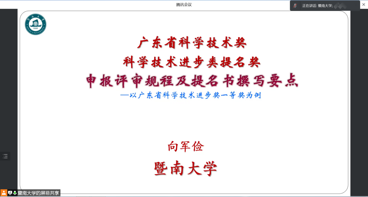 會上,暨南大學(xué)向軍儉教授(連續(xù)13年參加省和國家科學(xué)技術(shù)獎勵評審答辯、獲得教育部推薦科技進(jìn)步二等獎和廣東省科技進(jìn)步二等獎)詳細(xì)地為參會人員講解了國家和省部級科學(xué)技術(shù)獎的申報評審規(guī)程、推薦書撰寫條目要求,并通過實際的申報案例分析了相關(guān)注意事項,使大家對科學(xué)技術(shù)獎勵有了更多的了解和認(rèn)識。暨南大學(xué)科學(xué)技術(shù)研究處負(fù)責(zé)科技獎勵的工作人員針對科技獎勵申報及提名工作進(jìn)行了培訓(xùn),為老師們梳理了國家科技獎勵體系的重大變革、獎勵分類、申報原則及其他注意要點等,并與現(xiàn)場參會人員就獎勵申報各類問題進(jìn)行了互動交流。