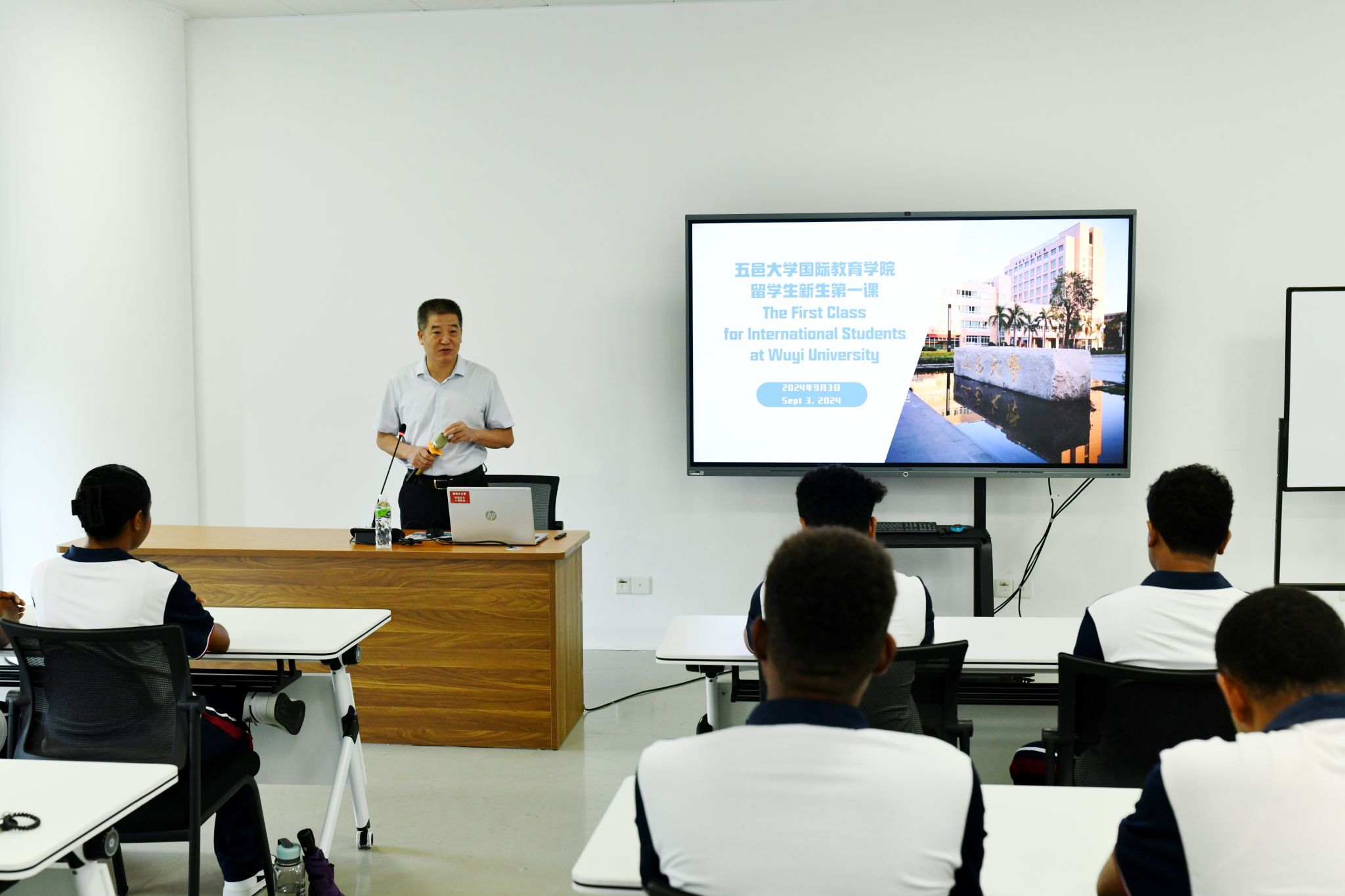9月3日上午,校長張運華以“跨越山海、共赴未來”為題為留學生講授入學第一課。課上,他介紹了五邑大學發展歷程和辦學特色,強調了五邑大學主動服務國家重大發展戰略,成立太平洋島國研究院支撐中國—太平洋島國防災減災合作中心建設,重點介紹了學校與太平洋島國的合作交流。他指出,學校立足人才培養功能,面向太平洋島國招應急通信與應急指揮專業來華留學生,為太平洋島國培養災害管理專業人才。他希望留學生在中國、在五邑大學學有所得、學有所成,運用專業知識技能助力自己國家提升防災減災能力、更好應對各種自然災害和風險挑戰,同時為推動中國與太平洋島國合作交流搭建更多友誼橋梁、貢獻青春力量。