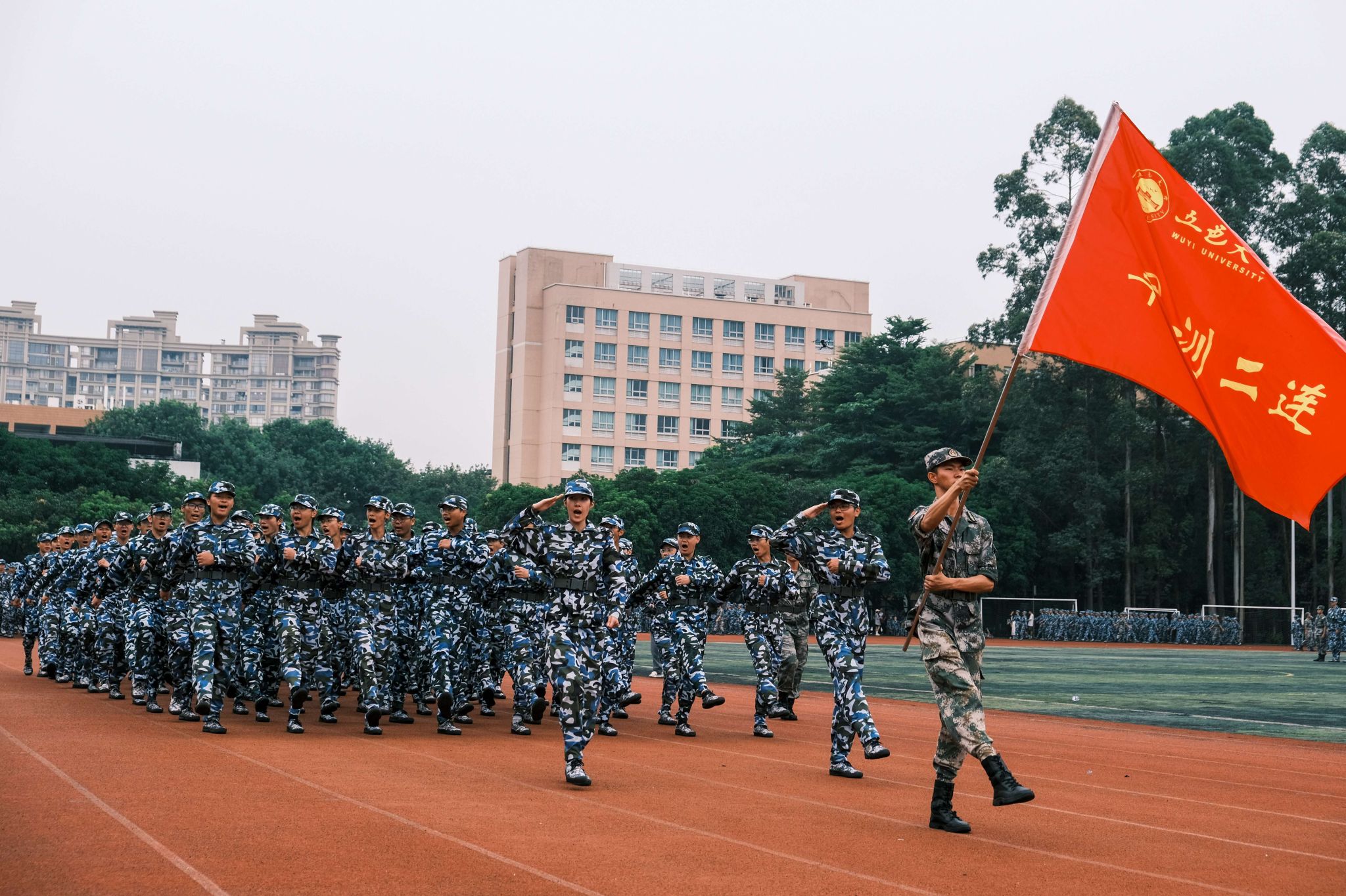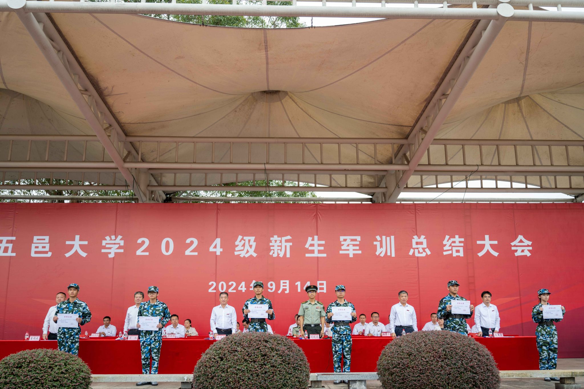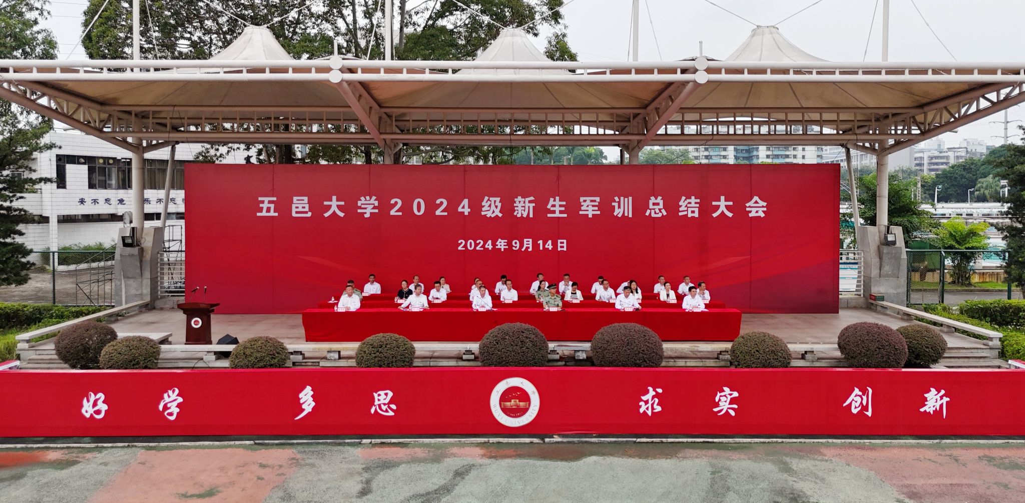 9月14日上午,五邑大學2024級新生軍訓總結大會在北區田徑運動場舉行。江門軍分區大校政治委員劉曉東蒞臨指導,校黨委副書記、校長張運華等校領導,五邑大學軍訓工作領導小組全體成員,各學院黨組織書記、副書記,新生輔導員和班導師代表出席總結大會。大會由學校黨委副書記、校長張運華主持。