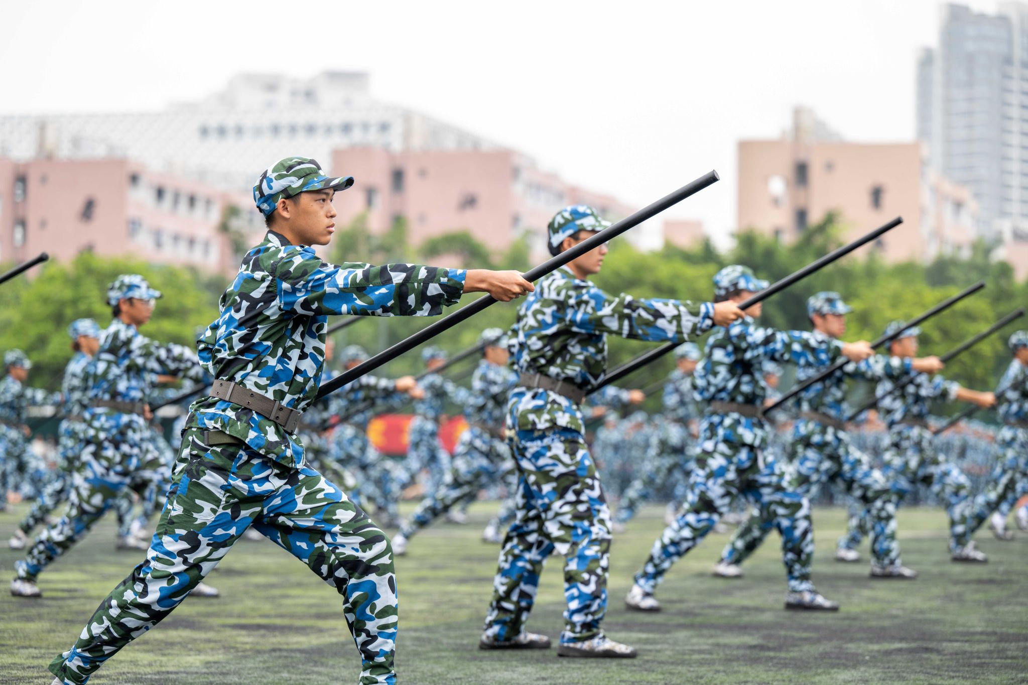 在匯報表演環節,同學們表演了軍訓隊列、刺殺操、應急棍術、匕首操、擒敵術、《強軍戰歌》合唱等項目,高昂的士氣、挺拔的軍姿展現了同學們在軍訓中刻苦訓練的成果,贏得了全場陣陣掌聲。響亮的口號、高亢的歌聲展現了同學們聽黨話、跟黨走、報黨恩的深厚情感和使命擔當,鼓舞斗志,激動人心,催人奮進。