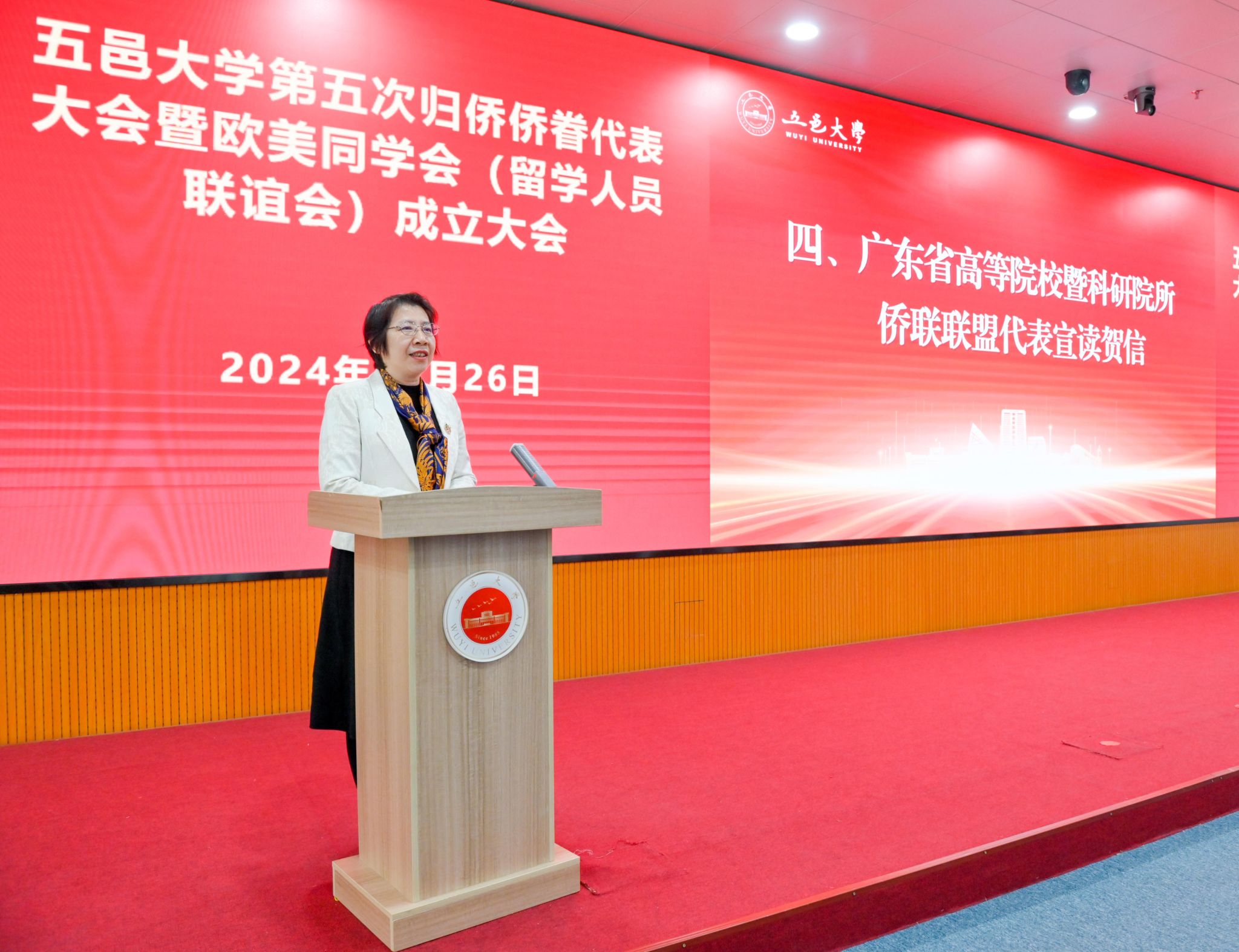 為進一步加強統戰及僑聯工作,按照上級工作要求,我校積極推進落實“地方僑聯+高校僑聯+校友會”工作機制,12月26日,學校舉行了第五次歸僑僑眷代表大會暨歐美同學會(留學人員聯誼會)成立大會。廣東省僑聯黨組成員、秘書長、廣東省僑青會主席陳農灝,江門市委統戰部常務副部長韓志勇,江門市僑聯黨組書記、主席林春暉,廣東省高等院校暨科研院所僑聯聯盟理事長單位代表、中山大學僑聯主席陳燕銘,以及來自暨南大學、華南農業大學、廣州中醫藥大學、廣東工業大學等兄弟高校僑聯負責人應邀出席會議。校黨委書記欒天罡,校黨委常委、副校長陳文華出席會議,相關職能部門負責人和歸僑僑眷代表、歐美同學會(留學人員聯誼會)代表等100多人參加會議。會議由陳文華主持。
