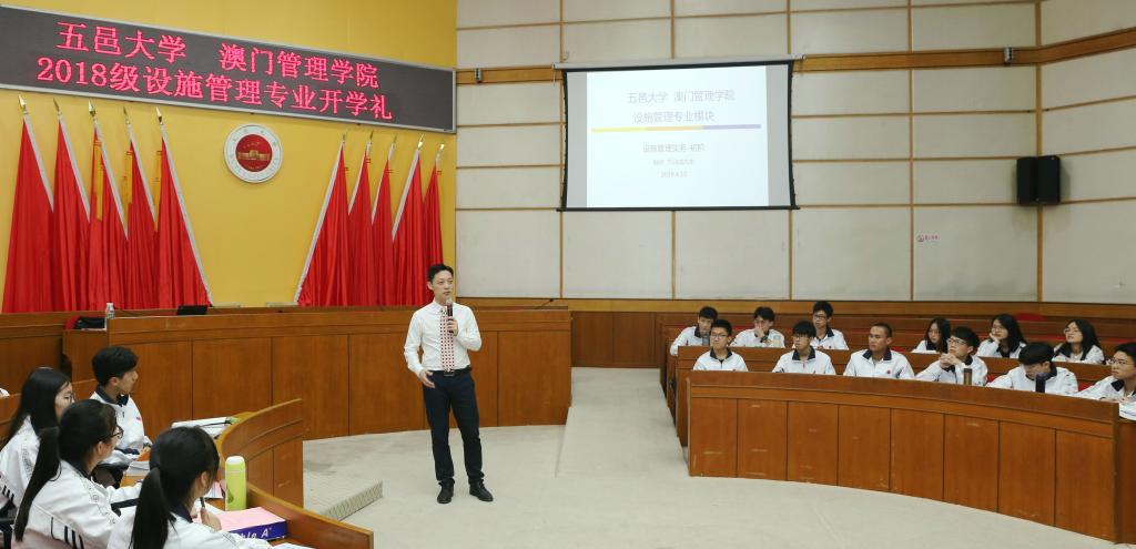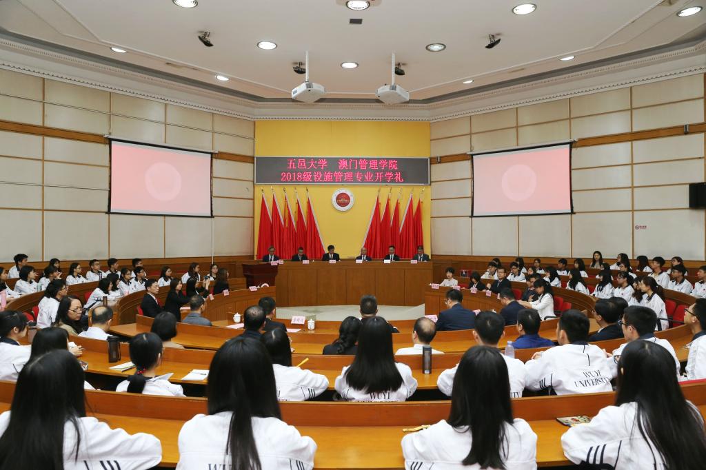 4月13日上午,在五邑大學國際會議廳舉行了“五邑大學 澳門管理學院2018級設施管理專業開學禮”。這是五邑大學與澳門管理學院的設施管理專業合作項目。