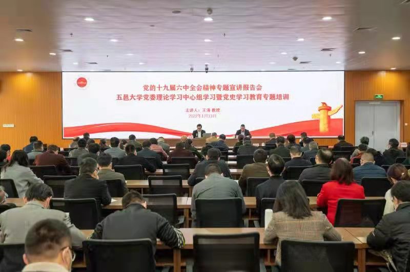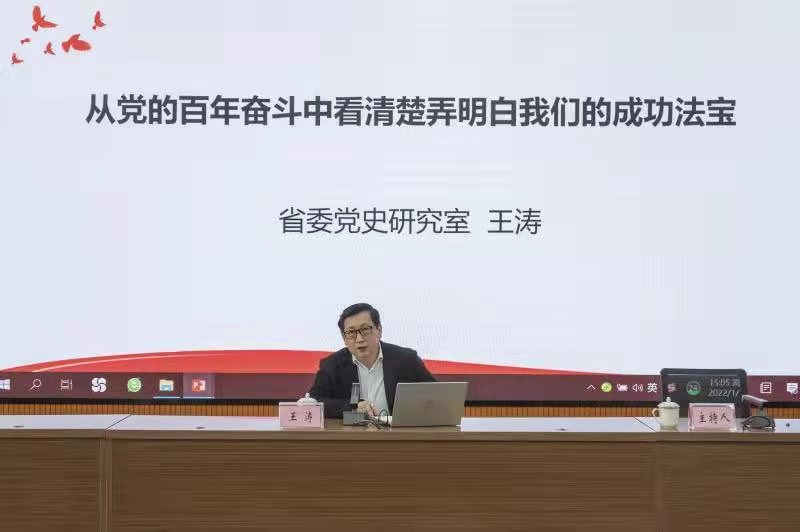 1月13日下午,學(xué)校開展黨委理論學(xué)習(xí)中心組學(xué)習(xí)暨黨史學(xué)習(xí)教育專題培訓(xùn),邀請省委宣講團(tuán)成員、省委黨史研究室副主任王濤教授蒞臨學(xué)校作學(xué)習(xí)貫徹黨的十九屆六中全會精神專題輔導(dǎo)報告——從黨的百年奮斗中看清楚弄明白我們的成功法寶。學(xué)校黨委書記張焜等校領(lǐng)導(dǎo)、黨委理論學(xué)習(xí)中心組成員、二級單位黨組織書記、科級以上干部、師生代表等參加學(xué)習(xí)。