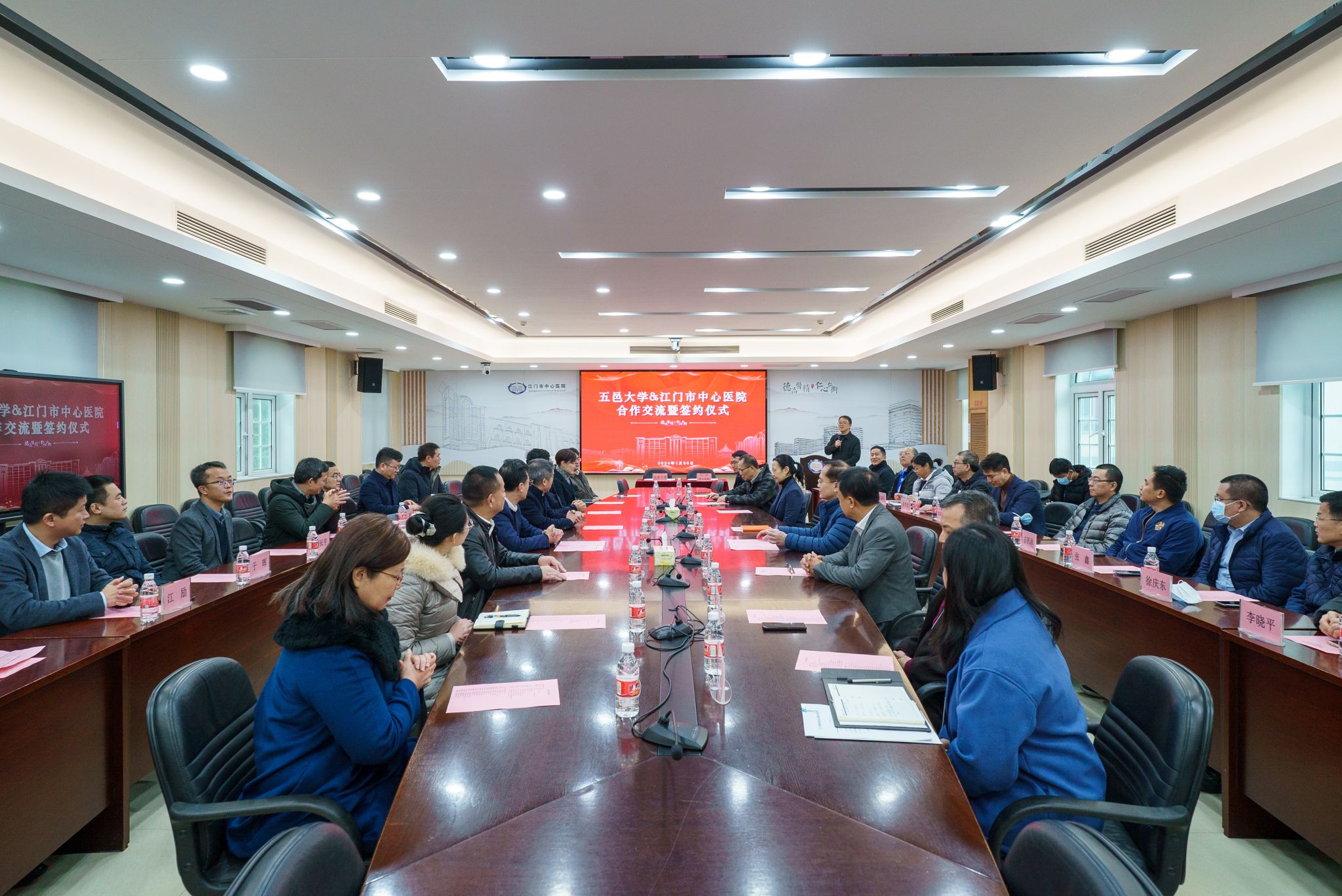 為深入貫徹黨的二十大關于推進健康中國建設的戰略部署,發揮高校和醫院各自優勢,共同探索教育合作、醫校合作新模式,開啟醫藥、醫工融合發展的新篇章,更好地推動學校、醫院高質量發展,1月26日,五邑大學與江門市中心醫院合作框架協議簽訂儀式在江門市中心醫院舉行。江門市中心醫院黨委書記左萬里,黨委副書記、院長黃炎明,黨委副書記、紀委書記張品,黨委委員、副院長周衛華,黨委委員、副院長阮曉紅,五邑大學黨委書記欒天罡,黨委副書記、校長張運華,黨委常委、副校長董超俊,雙方相關單位負責人等參加簽約儀式。儀式由江門市中心醫院黨委副書記、紀委書記張品主持。