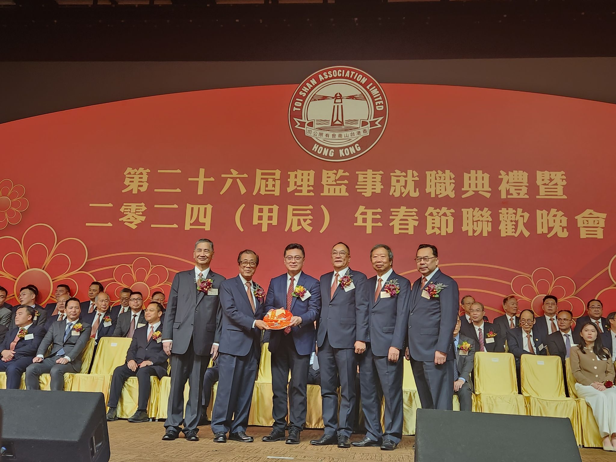 欒天罡一行應邀參加香港臺山商會第二十六屆理監事就職典禮,與鄉親們歡聚一堂,共敘情誼。欒天罡代表學校致送紀念品,感謝香港臺山商會一直以來大力支持學校教育事業發展,在學校即將迎來40周年校慶之際,希望商會繼續關注支持五邑大學發展,共創輝煌。