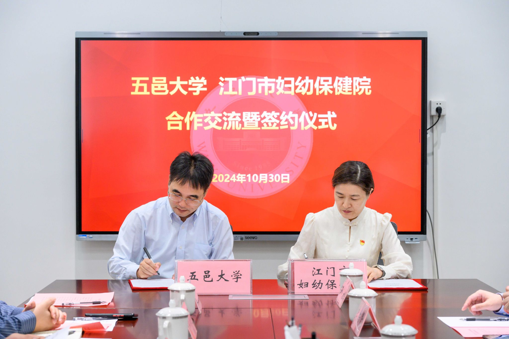 為深入貫徹黨的二十屆三中全會關于實施健康優先發展戰略的部署要求,發揮高校和醫院各自優勢,共同探索教育合作、醫校合作新模式,10月30日,五邑大學與江門市婦幼保健院在策文商學院大樓副樓201會議室簽訂合作框架協議。江門市婦幼保健院黨委書記孟偉,黨委委員、副院長王松柏,五邑大學黨委常委、副校長陳文華,以及雙方相關單位負責同志參加簽約儀式。儀式由五邑大學科技處處長劉長宇主持。