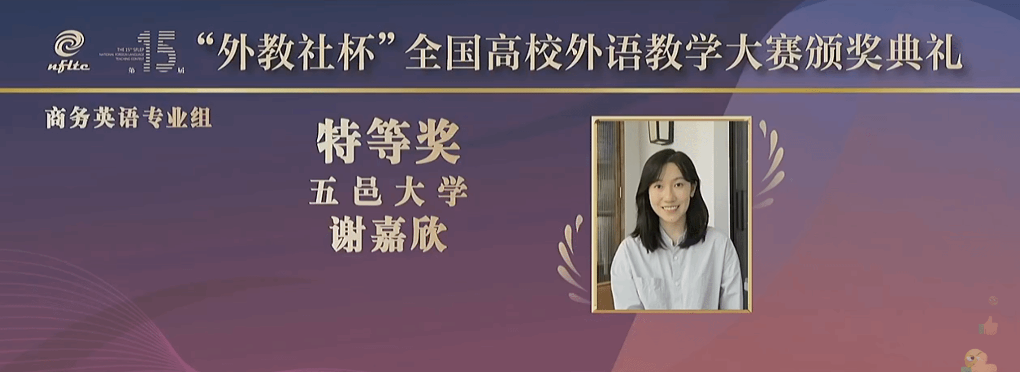 12月6日—8日,第十五屆“外教社杯”全國高校外語教學大賽全國決賽、總決賽在上海成功舉辦。從各省市分賽區比賽中脫穎而出的79位優秀外語教師同臺競技,經過激烈角逐,我校外國語學院謝嘉欣老師憑借出色的表現榮獲商務英語專業組特等獎,實現了學校在該項國家級賽事零的突破。
