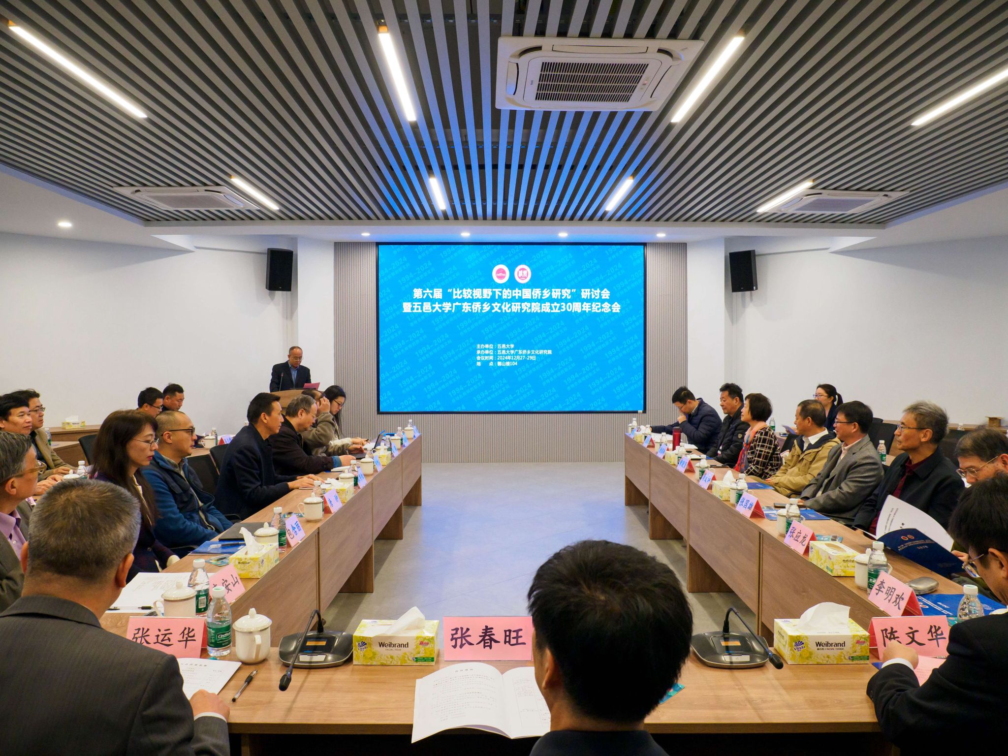 2024年12月28日,第六屆“比較視野下的中國僑鄉(xiāng)研究”研討會暨五邑大學(xué)“僑鄉(xiāng)文化與遺產(chǎn)”學(xué)科創(chuàng)設(shè)30周年紀念會在五邑大學(xué)舉辦。中國華僑歷史學(xué)會副會長、中國華僑華人研究所原所長張春旺研究員,世界海外華人研究學(xué)會主席、中國華僑歷史學(xué)會副會長李明歡教授,暨南大學(xué)國際關(guān)系學(xué)院/華僑華人研究院張應(yīng)龍研究員;五邑大學(xué)黨委常委、副校長陳文華教授,五邑大學(xué)原校長張運華教授,五邑大學(xué)原副校長、學(xué)術(shù)委員會主任、廣東僑鄉(xiāng)文化研究院張國雄教授出席研討會。來自北京大學(xué)、中山大學(xué)、廈門大學(xué)、暨南大學(xué)、海南師范大學(xué)、溫州大學(xué)、嘉應(yīng)學(xué)院、韓山師范學(xué)院、福建技術(shù)師范學(xué)院、云南紅河學(xué)院、廣東南方職業(yè)學(xué)院和五邑大學(xué)等十多所高校和科研機構(gòu)的專家學(xué)者齊聚一堂,共同回顧五邑大學(xué)“僑鄉(xiāng)文化與遺產(chǎn)”學(xué)科30年建設(shè)取得的豐碩成果,共同展望中國僑鄉(xiāng)研究未來方向和路徑。云南大學(xué)、暨南大學(xué)國際關(guān)系學(xué)院、溫州大學(xué)華僑學(xué)院、海南熱帶海洋學(xué)院東盟研究院等發(fā)來賀電。