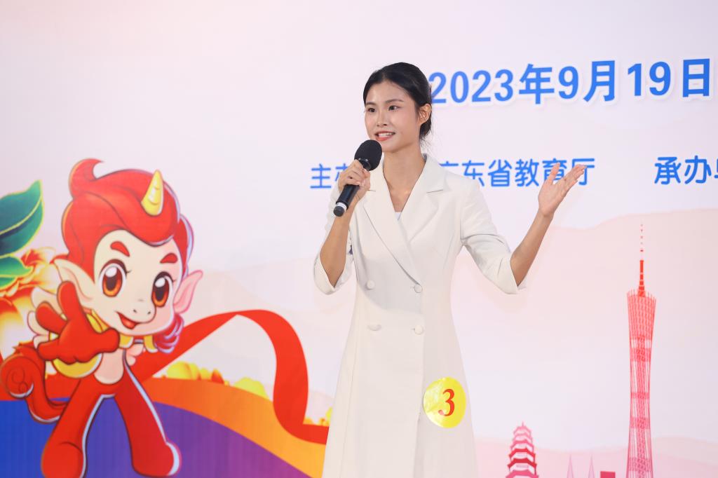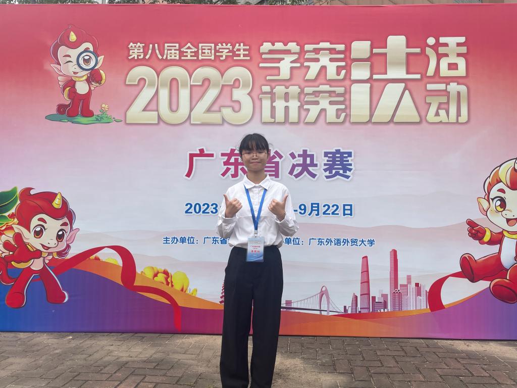 自2016年起,廣東省每年開展全省學生“學憲法 講憲法”活動,歷經八年已逐漸成為青少年憲法學習宣傳的一張“金名片”。本次演講比賽共收到98所高校參賽選手作品。馮雅雯以省級決賽視頻初選第一名進入現場決賽。決賽分為主題演講和命題演講兩部分,在主題演講中,馮雅雯以“憲法筑牢共同根魂夢”為主題,講述五邑華僑與憲法的故事,展現了廣大僑胞始終同祖國同呼吸、共命運,同興衰、共榮辱的赤子情懷。在命題演講環節,馮雅雯以希望工程標志“大眼睛女孩”為例子切入,緊密結合社會熱點、案例事例談自身經歷、感受,表明憲法保障公民受教育權利的重要性,演講感情飽滿,贏得了嘉賓評委和現場觀眾陣陣掌聲,獲得評委老師的高度評價。