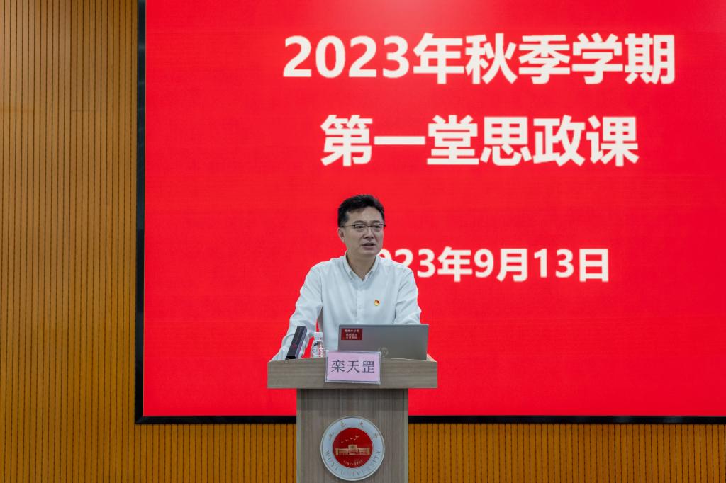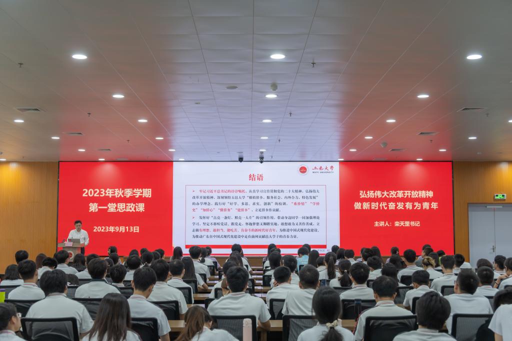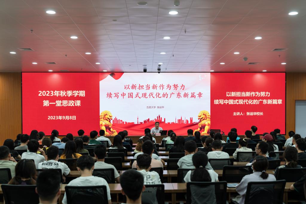9月8日下午,校長張運華以“以新?lián)?dāng)新作為努力續(xù)寫中國式現(xiàn)代化的廣東新篇章”為題為120余名研究生講授了秋季學(xué)期“思政第一課”。學(xué)校相關(guān)部門負責(zé)人、各學(xué)院(部)黨委(黨總支)副書記、馬克思主義學(xué)院黨政班子成員及全體教師參加聽課學(xué)習(xí)。