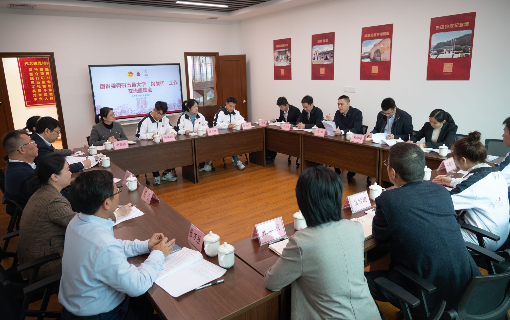 在“兩基地兩中心”研討室,范春一行聽取了五邑大學“挑戰杯”工作開展情況匯報,并圍繞廣東青年大學生“百千萬工程”突擊隊行動等工作與學校師生進行座談交流。
